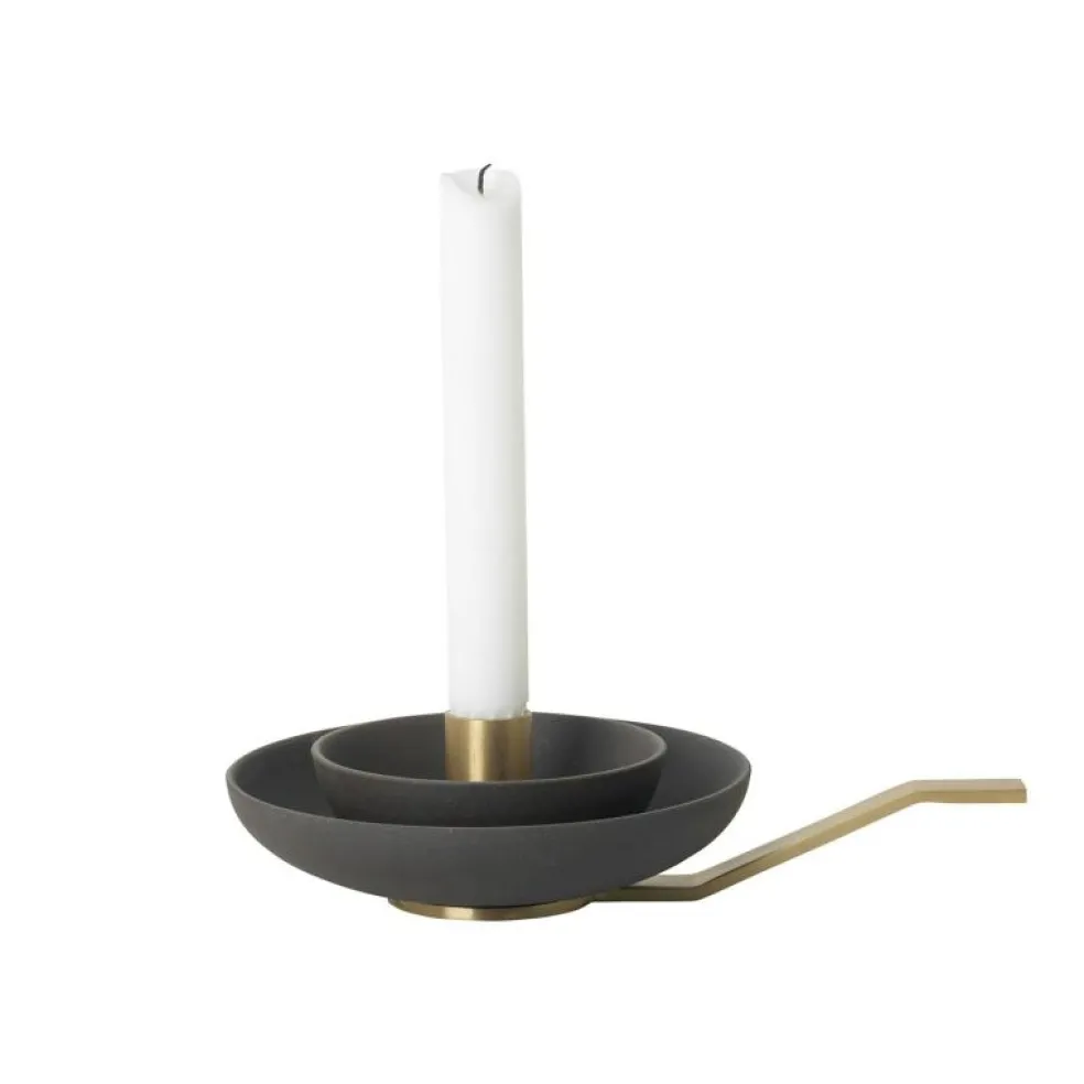 Vacker ljusstake från Ferm Living. Dess design och form, med handtaget gör att den enkelt går att flytta till dit du vill ha den. Denna ljusstaken finns i färgerna Rost och Charcoal. Se till att släcka ljuset innan det når mässingsdelen, eftersom det kan värmas upp och lämna märken.