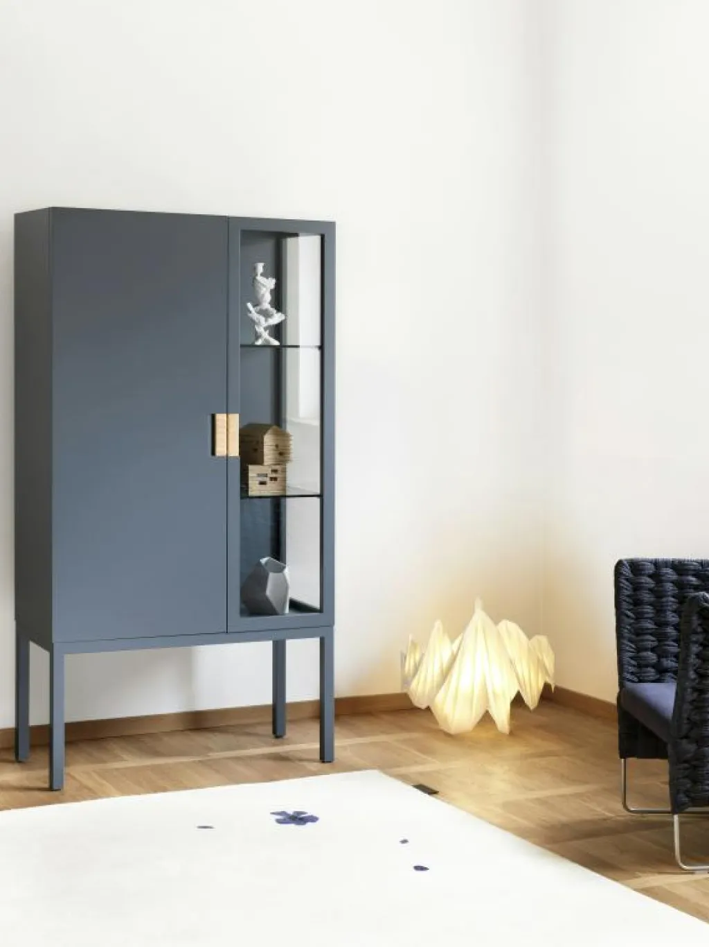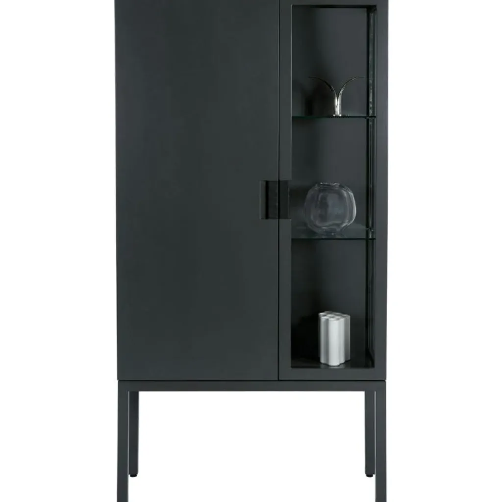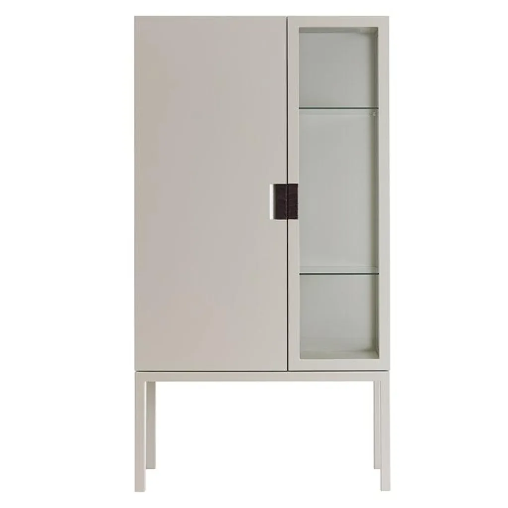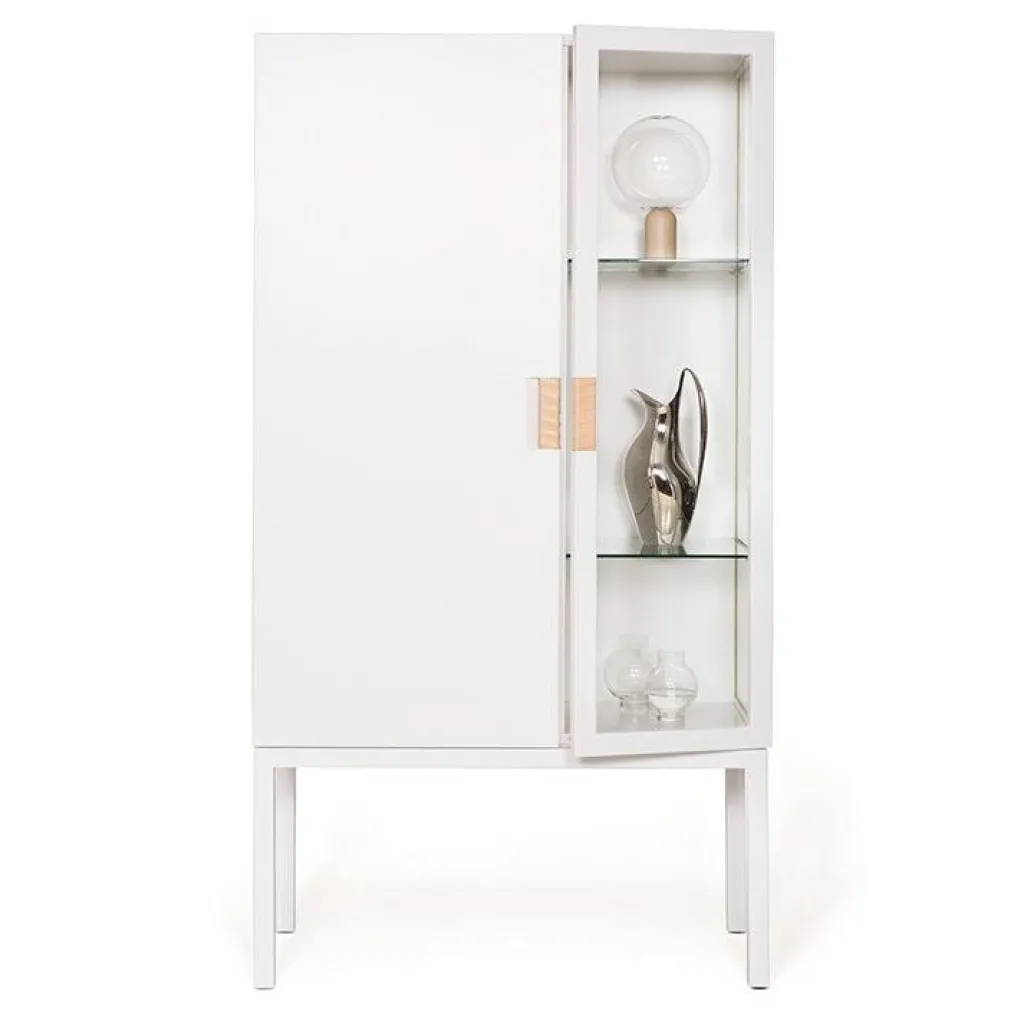 – Vitrinskåp i lackerad MDF med fällbara dörrar.