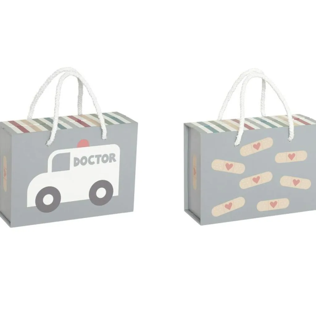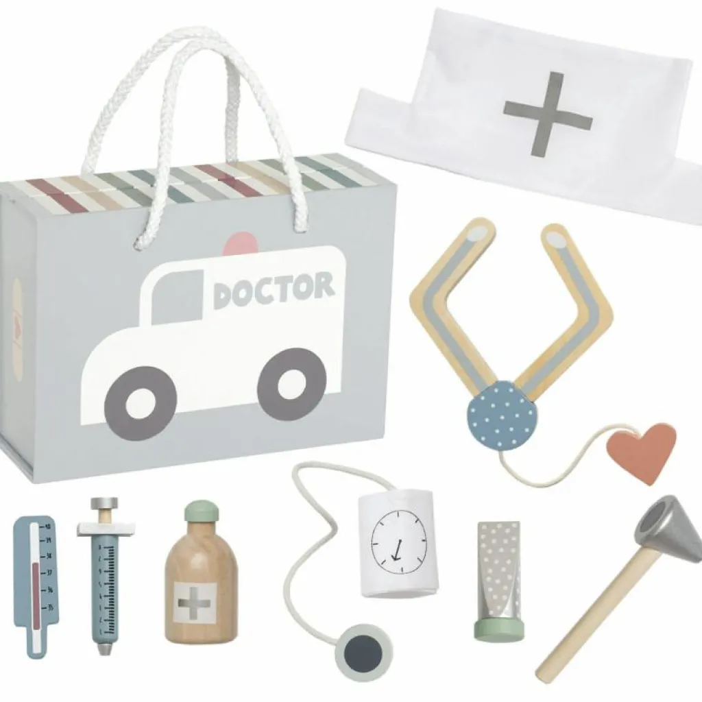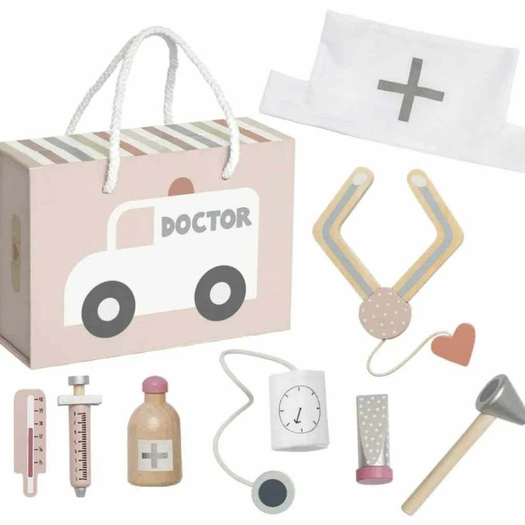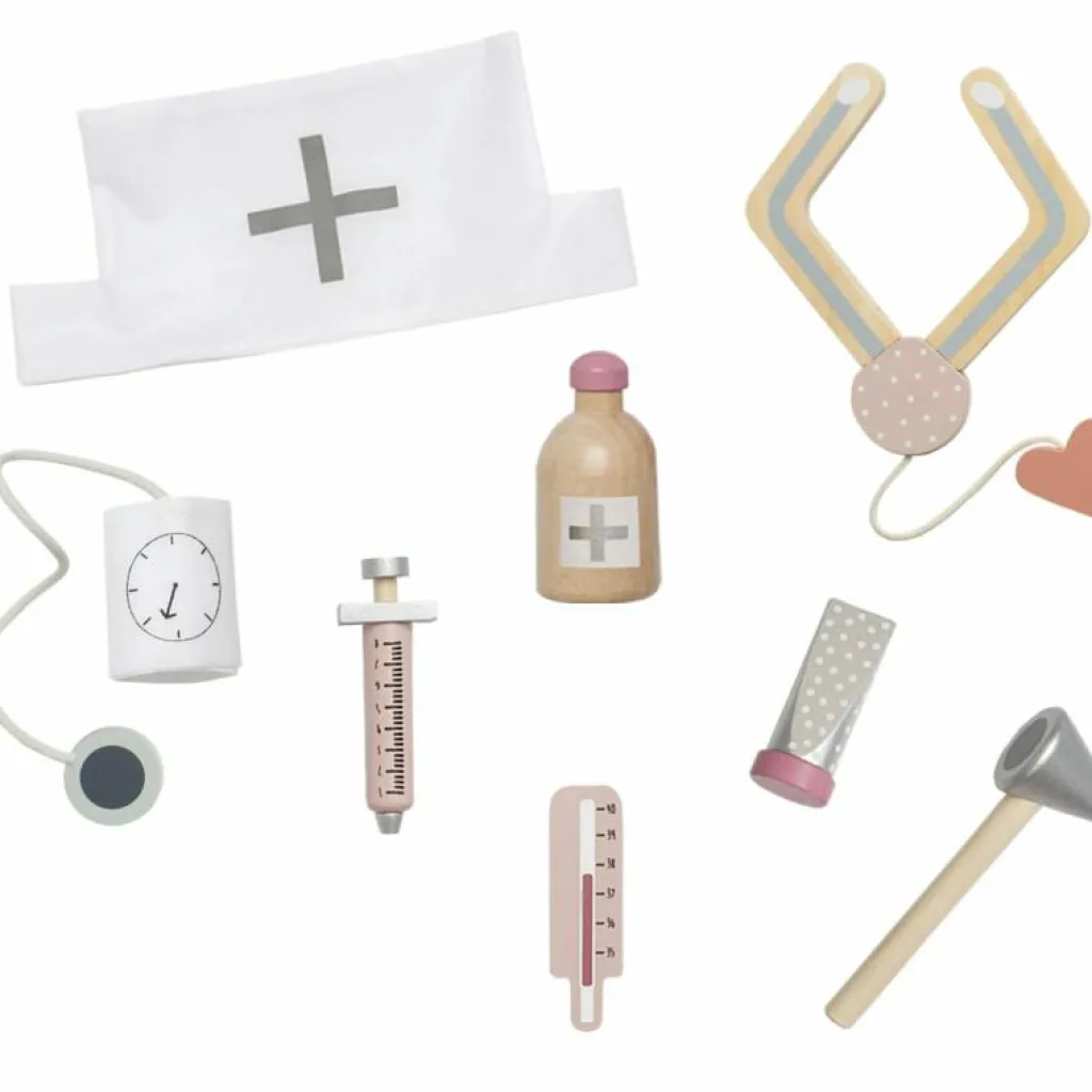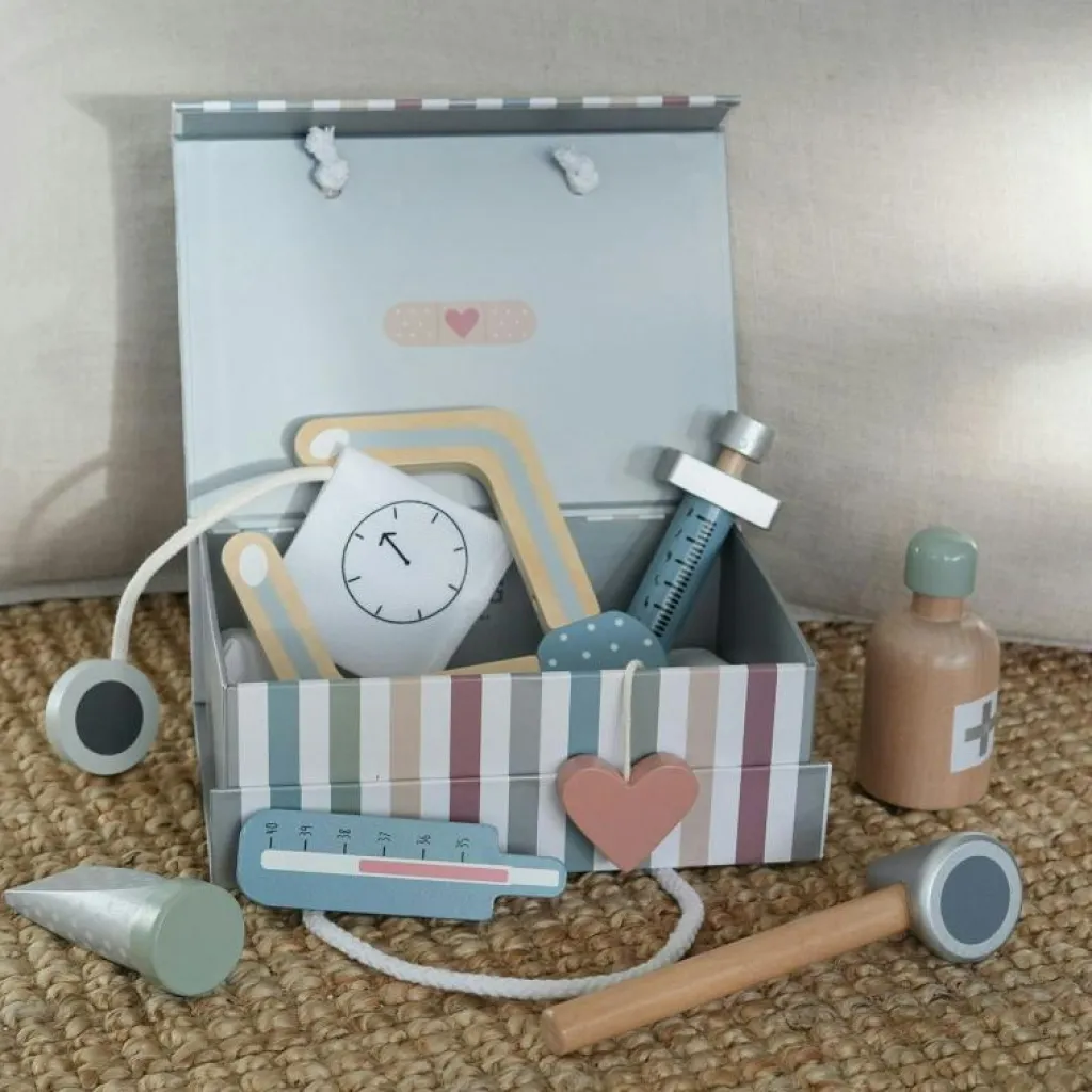 – Läkarväskan innehåller: 1x spruta 1x stetoskop av trä 1x termometer 1x salva 1x blodtrycksmätare 1x doktorshatt 1x medicinflaska 1x otoskop (instrument för ögon och öron).