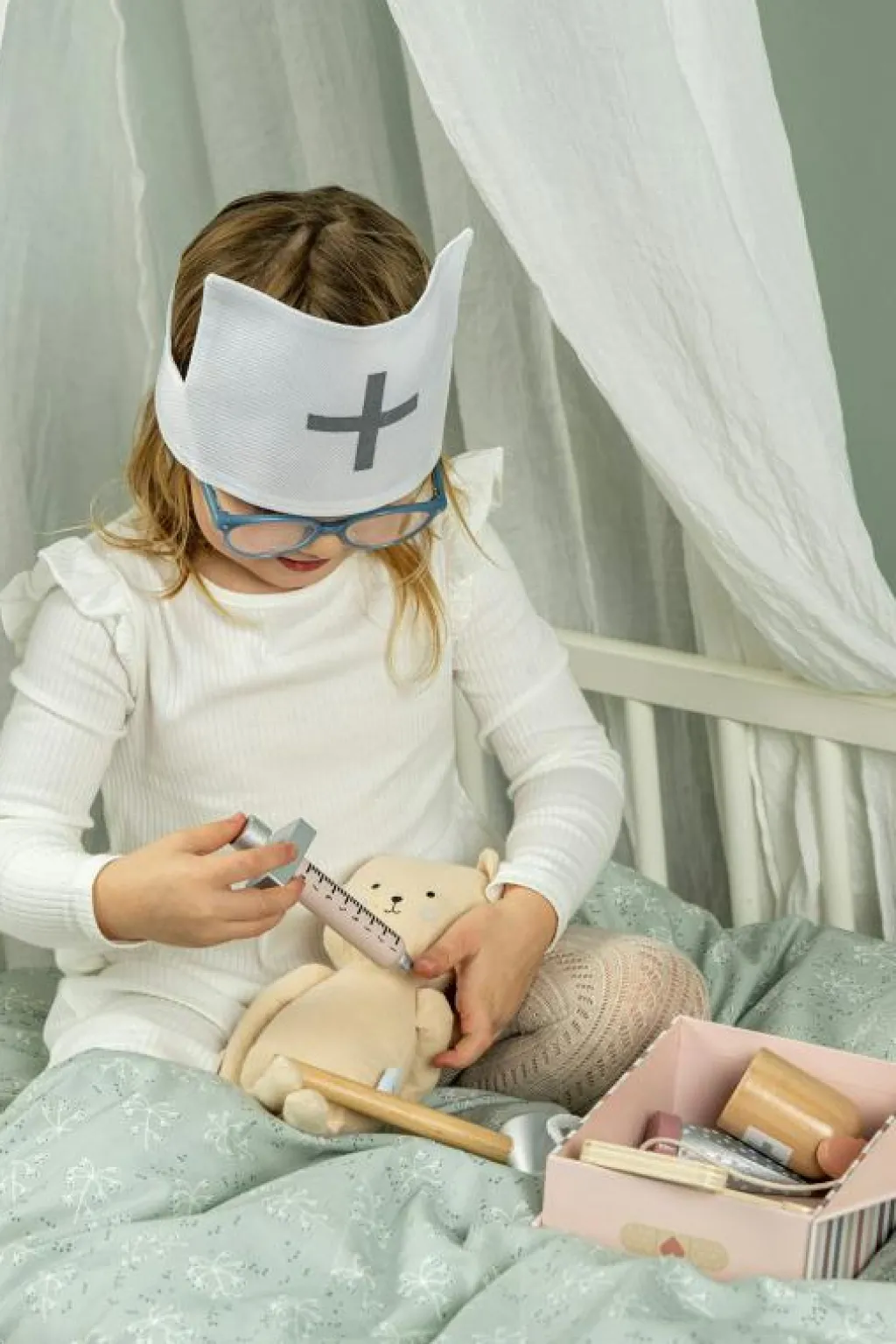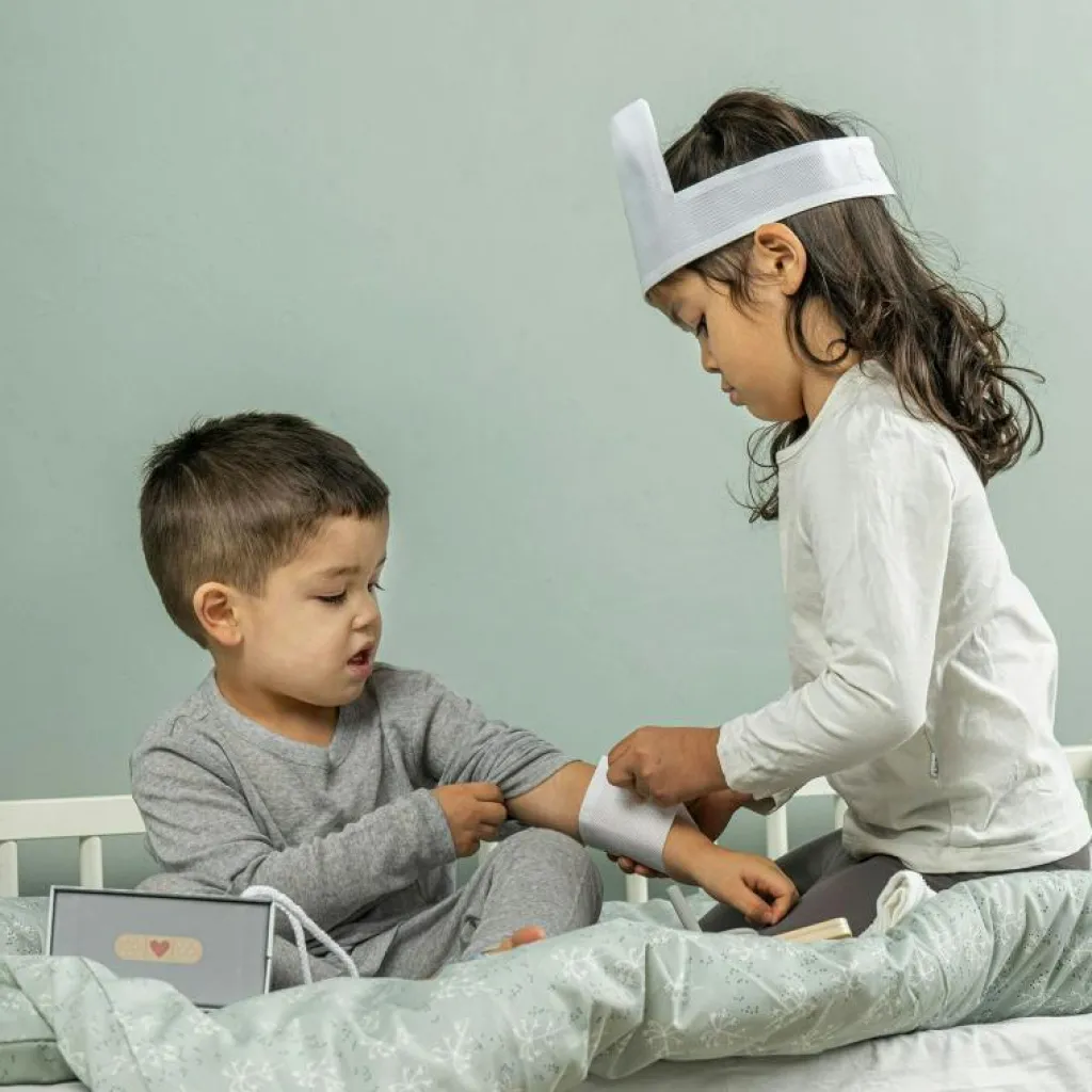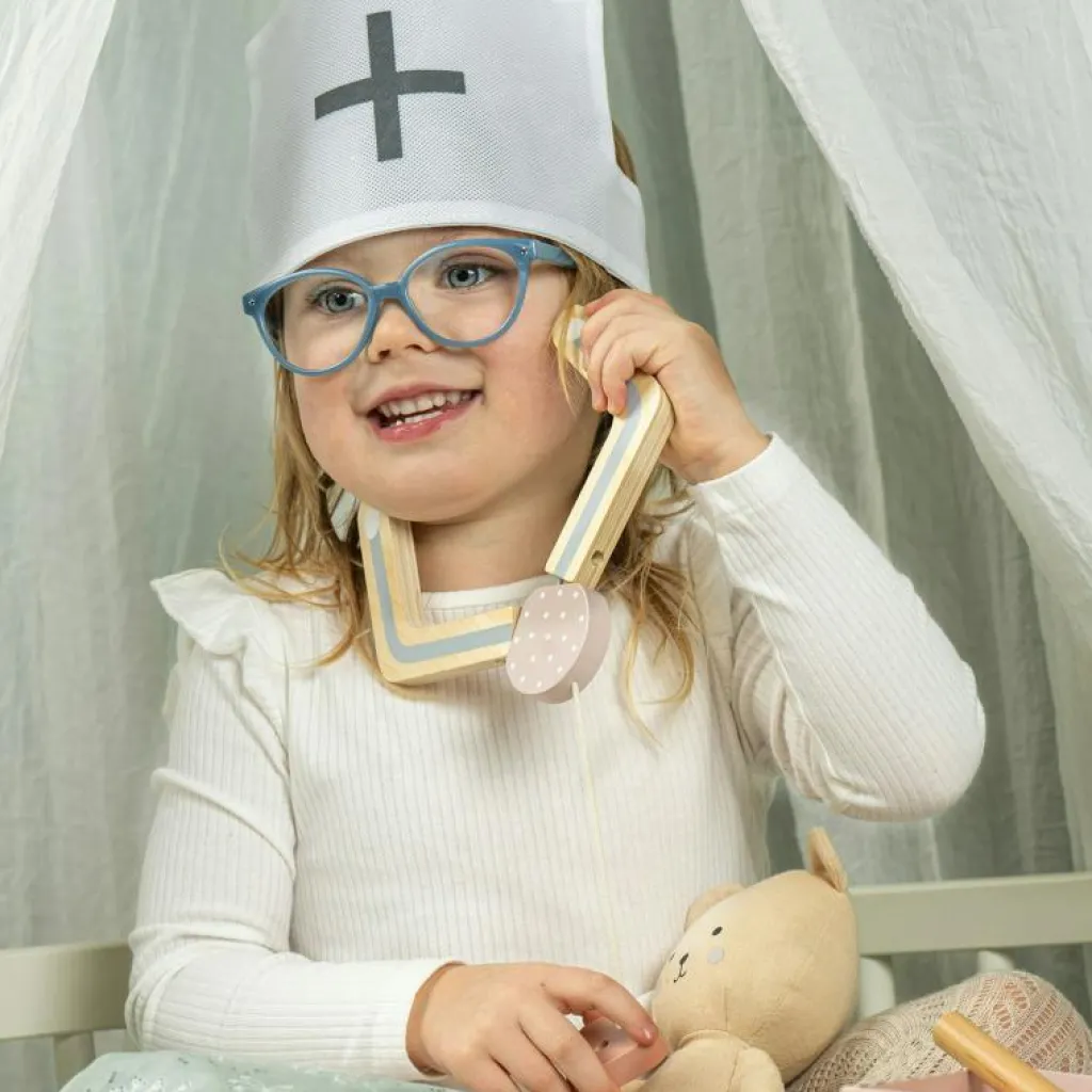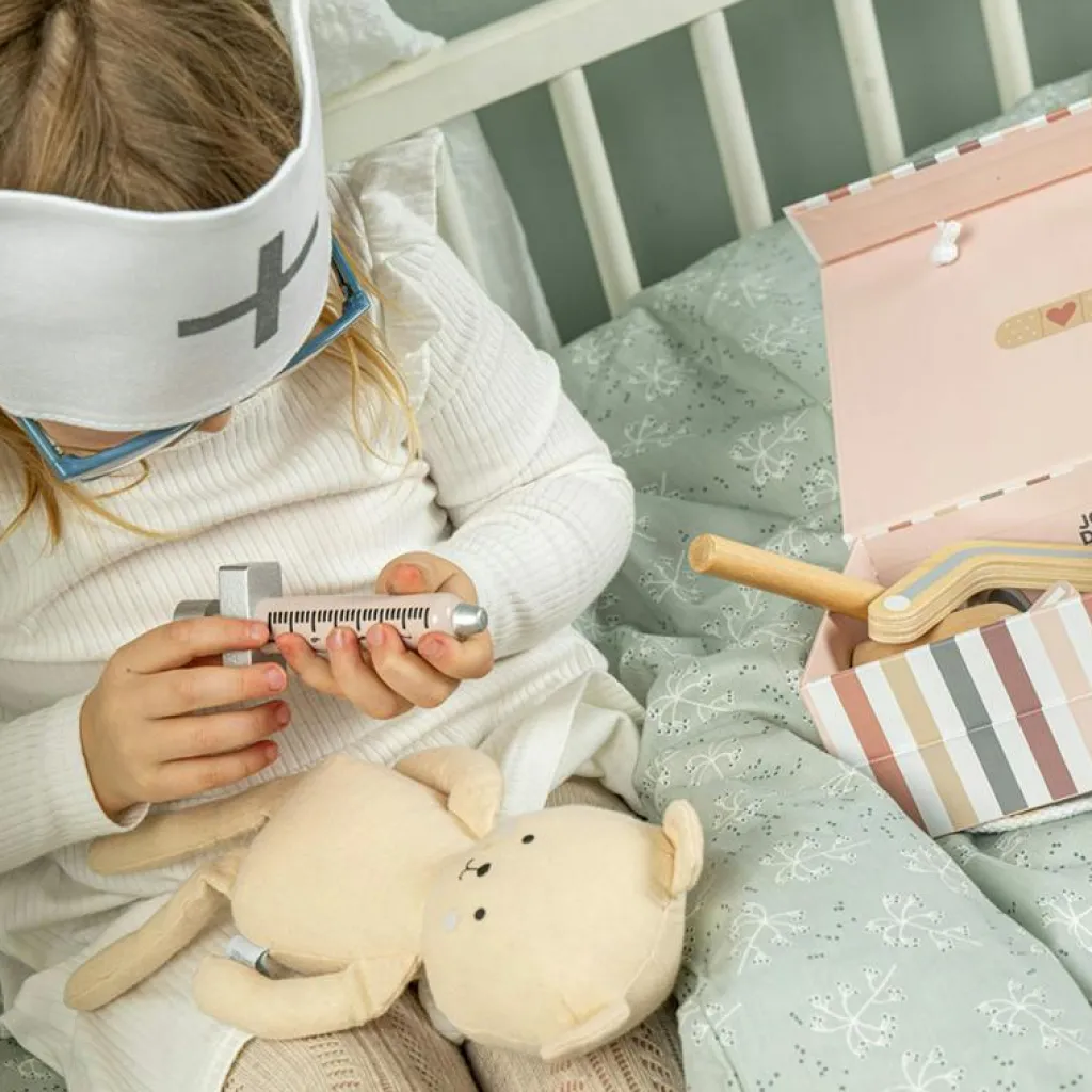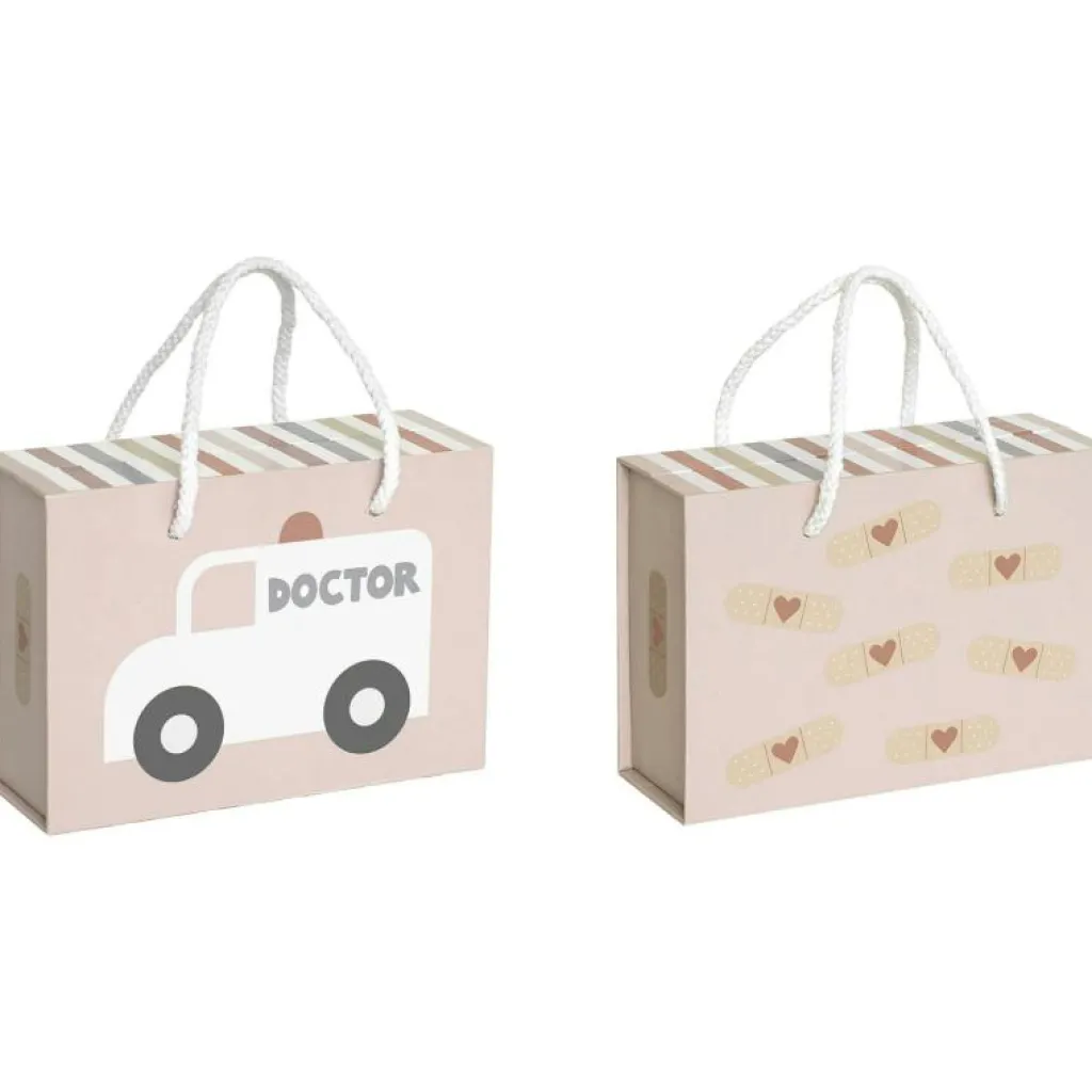 – Läkarväskan innehåller: 1x spruta 1x stetoskop av trä 1x termometer 1x salva 1x blodtrycksmätare 1x doktorshatt 1x medicinflaska 1x otoskop (instrument för ögon och öron).