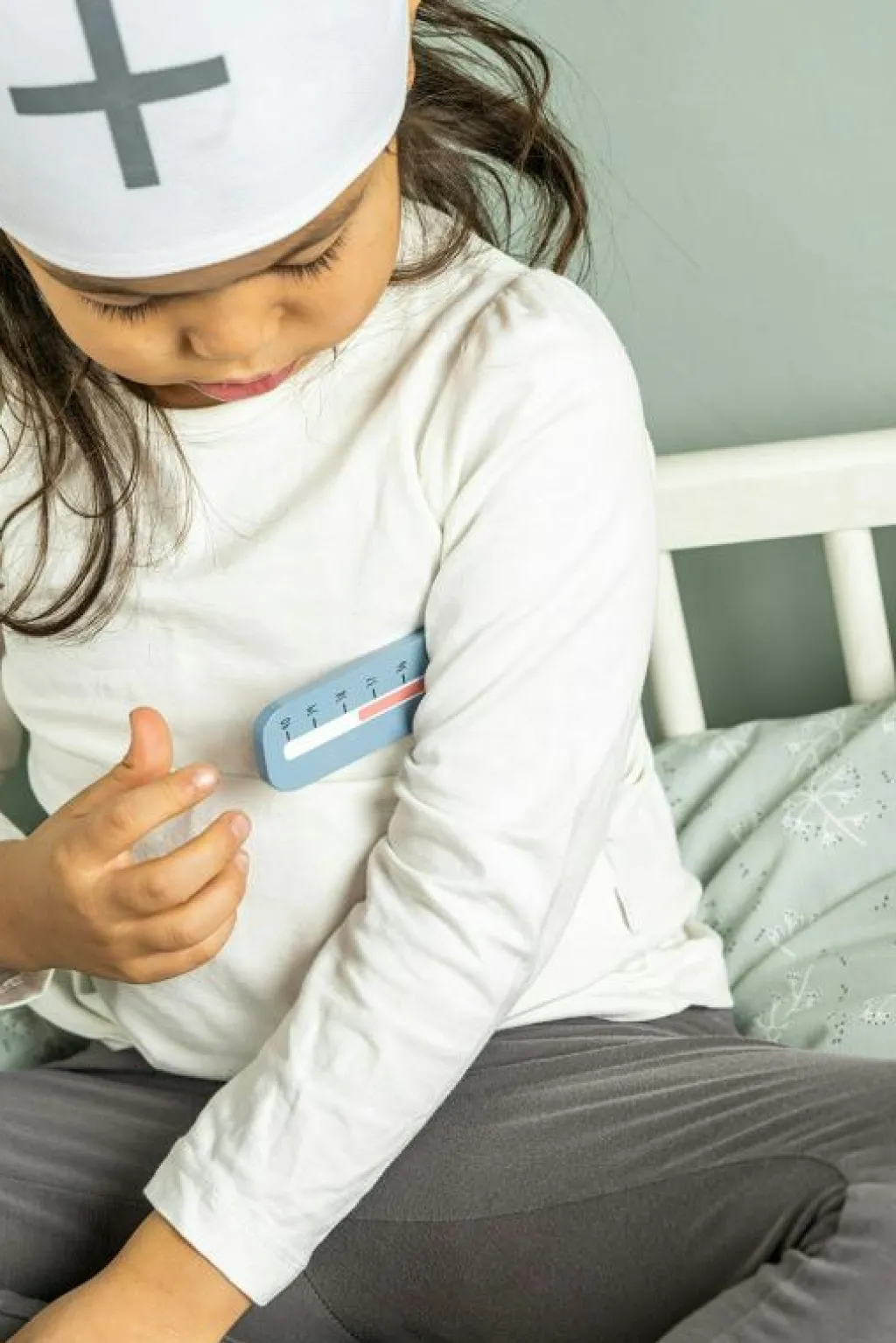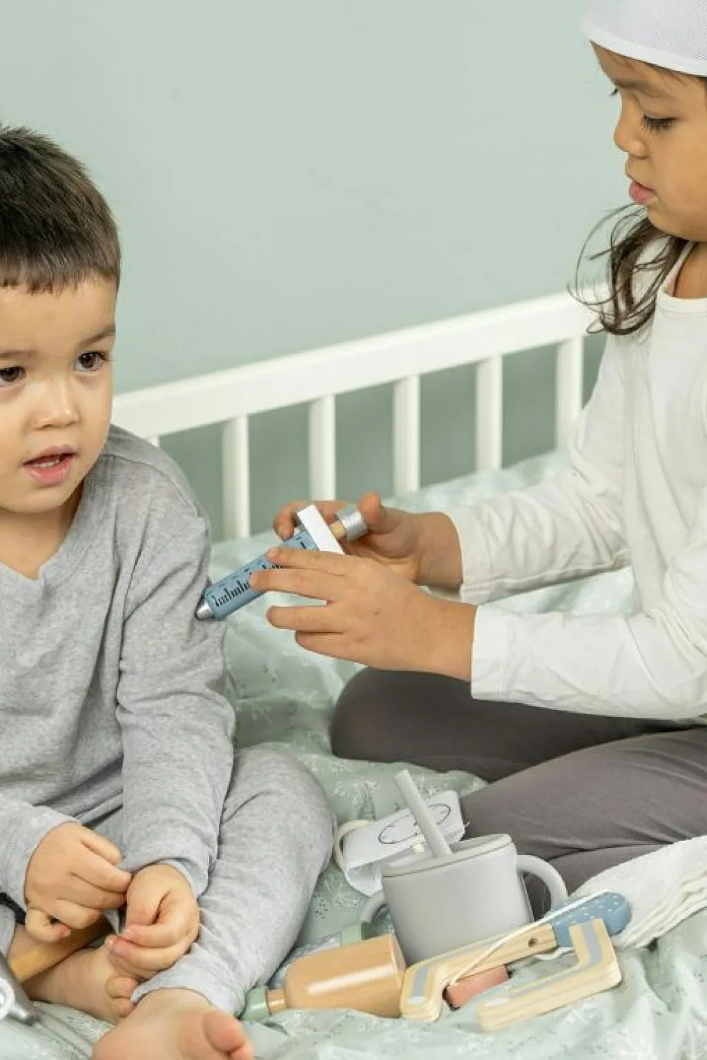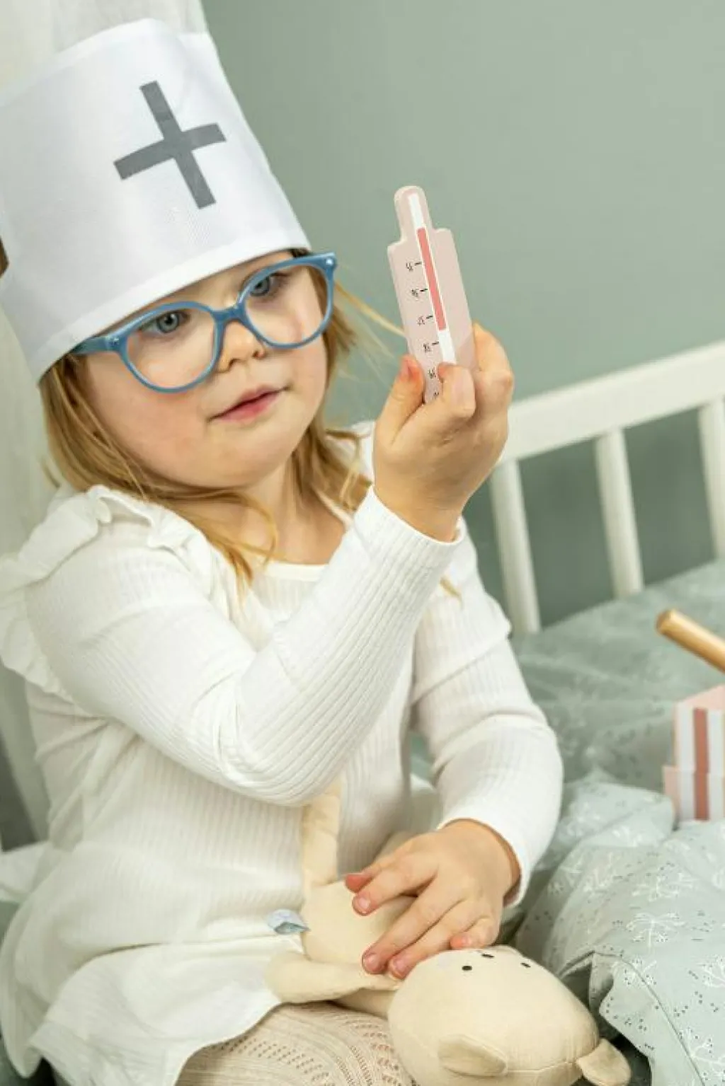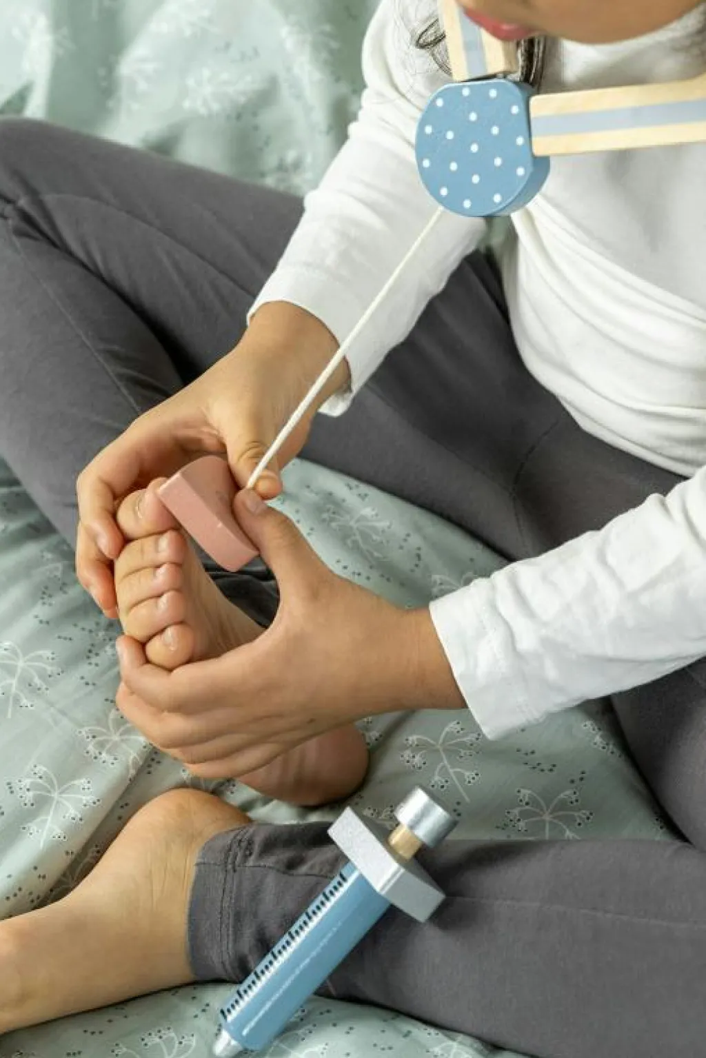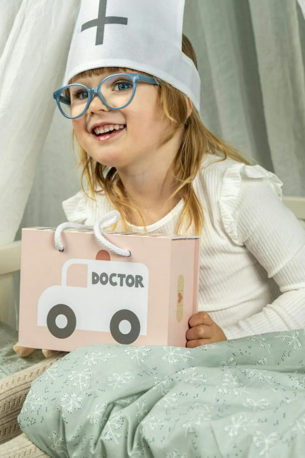 – Läkarväskan innehåller: 1x spruta 1x stetoskop av trä 1x termometer 1x salva 1x blodtrycksmätare 1x doktorshatt 1x medicinflaska 1x otoskop (instrument för ögon och öron).