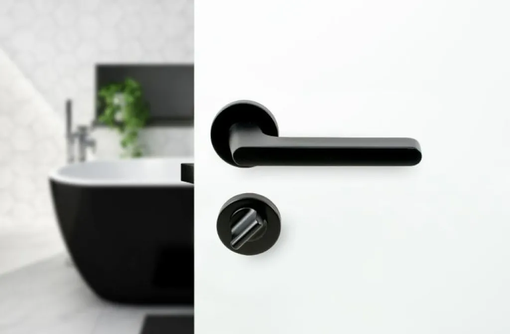 Toalettvred R-52 från Beslag Design matchas med Tavira dörrhandtag och Helix dörrhandtag.