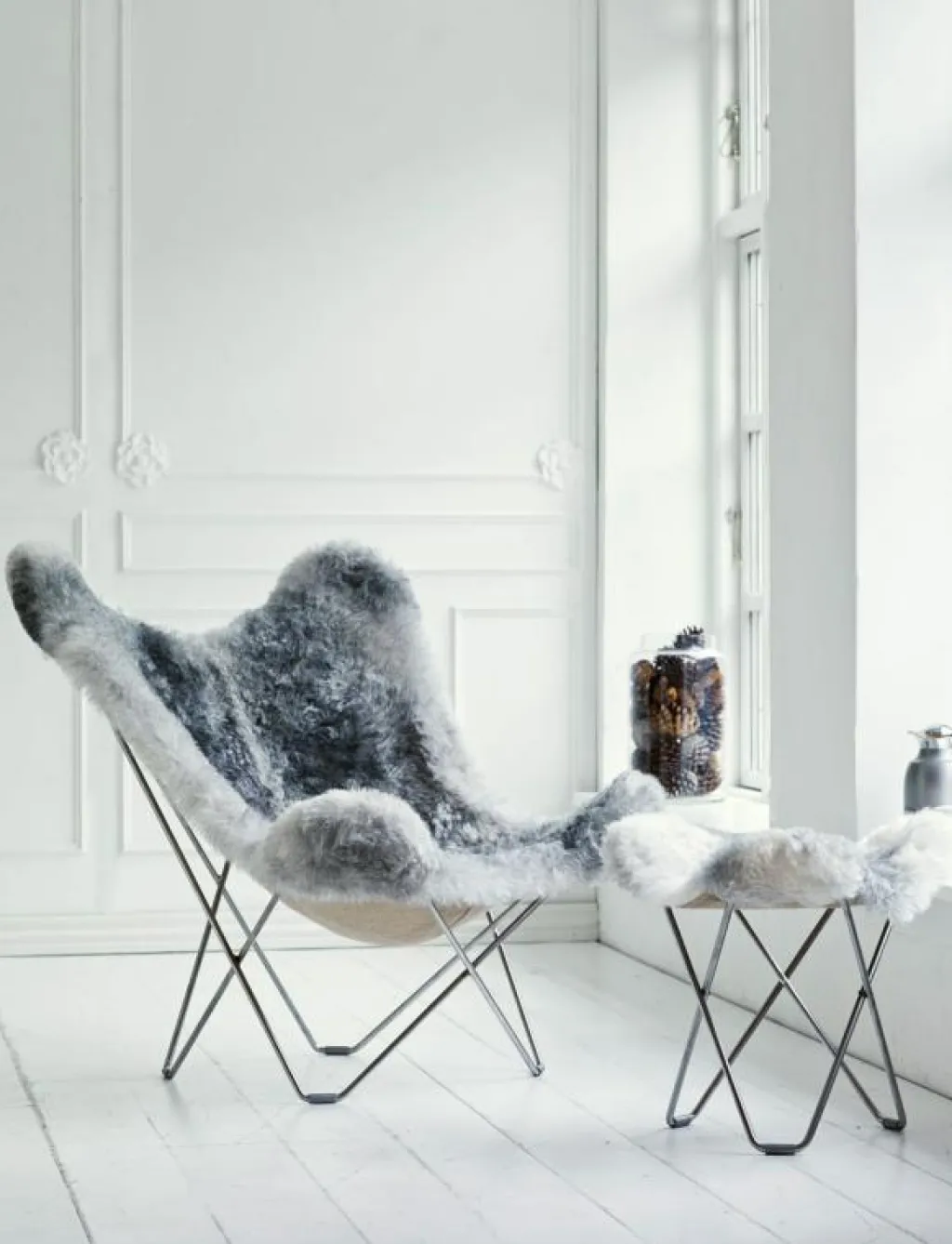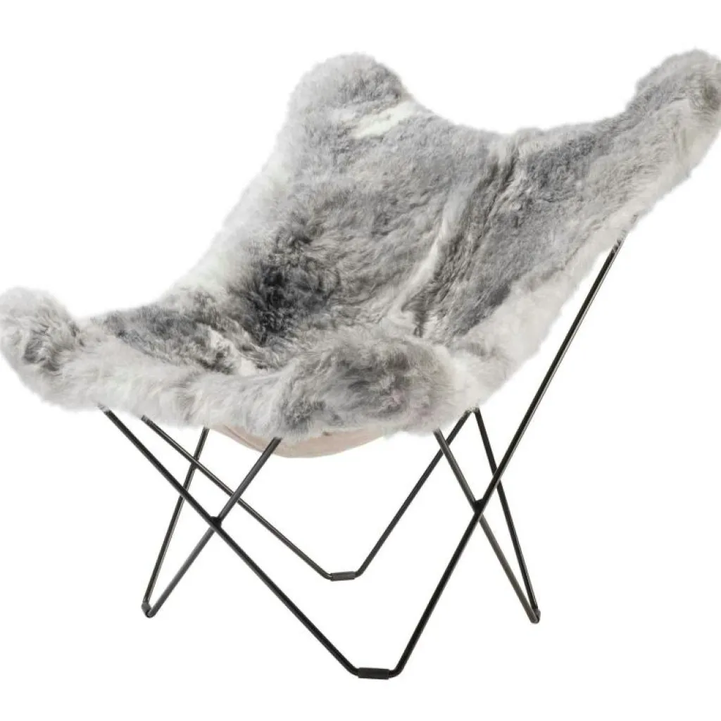 Iceland Mariposa Butterfly Chair är en riktig klassiker i ny tappning i både modell och material. Den är mycket större än originalet vilket gör den ännu skönare att sitta i. Lammskinnet kommer från Island och väljs ut mycket noggrant. Bara ett på hundra får föds naturligt grå på Island och det är därför mycket exklusivt. Den tillverkas i Småland med stor hantverksskicklighet och miljötänk. Underredet är gjort av massivt svenskt extra hårt stål. Eftersom lammskinnet är ett naturmaterial får varje stol ett unikt utséende och om du tar hand om den kommer stolen att hålla i generationer tack vare den underbara kvaliteten. Denna designikon används flitigt på kontor, hotell, konstutställningar, inredningstidningar och i privata hem förstås. Lammskinnet finns i flera olika färger, korthårigt (Shorn) eller långhårigt (Wild) skinn och med svart eller kromat underrede. I samma modell finns också Pampa Mariposa som är klädd med italienskt högkvalitativt läder. Till dessa fåtöljer finns även en pall i flera olika utföranden.