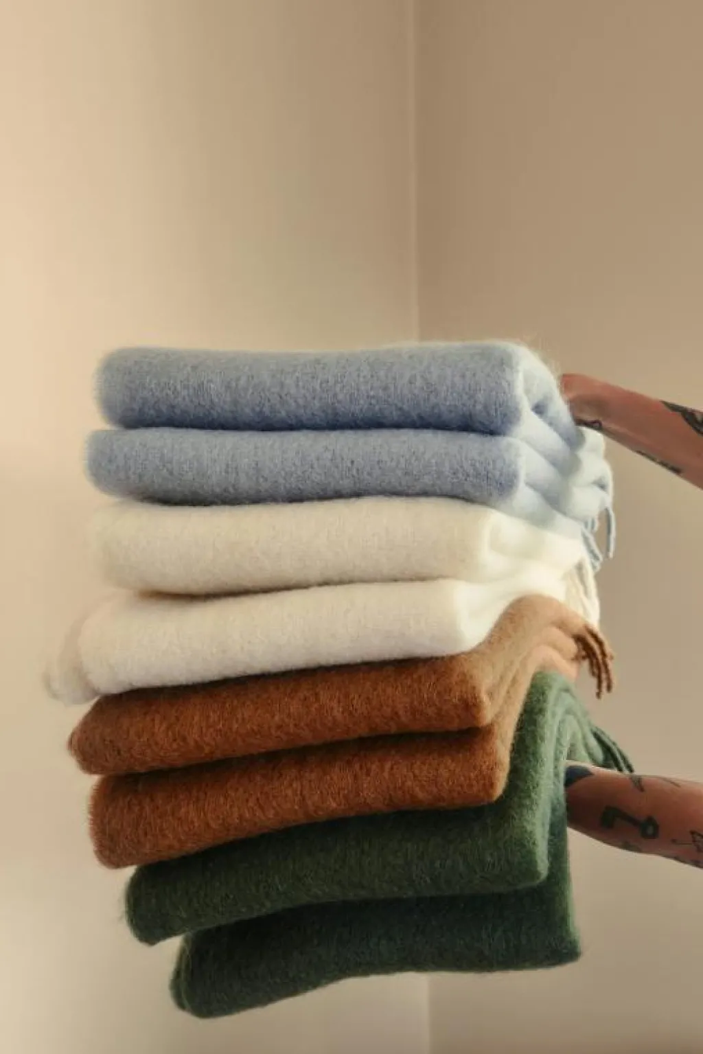 – Den varsamt borstade mohairstrukturen ger pläden en unik, fluffig finish som kombinerar elegans med komfort.