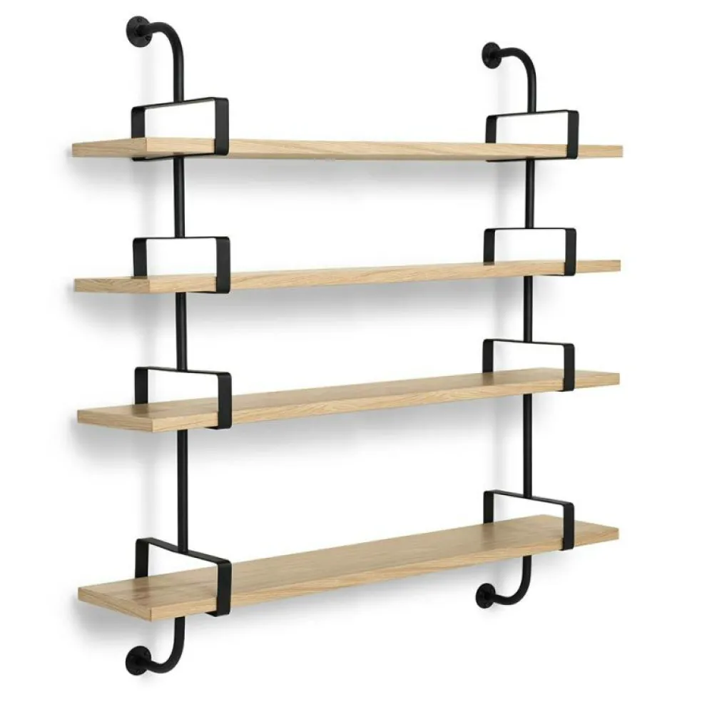 Ett hyllsystemsom äranpassningsbartefter tycke och yta. Svartlackerade gavlar och hyllplan av trä som adderar en ny nivå av estetik till ditt hem.