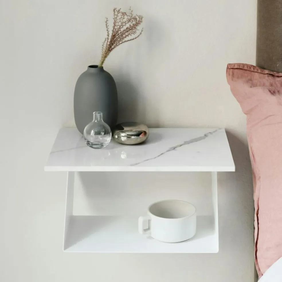 Edgy Edition från Maze är en svensktillverkad hylla med underrede i återvunnen metall och keramisk skiva på toppen. Passar bra som sängbord eller som en vägghängd hylla där det behövs en avställningsyta utan att ta upp golvyta, som exempelvis i hallen eller sovrummet.
