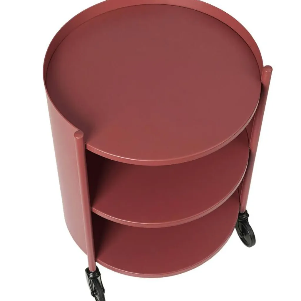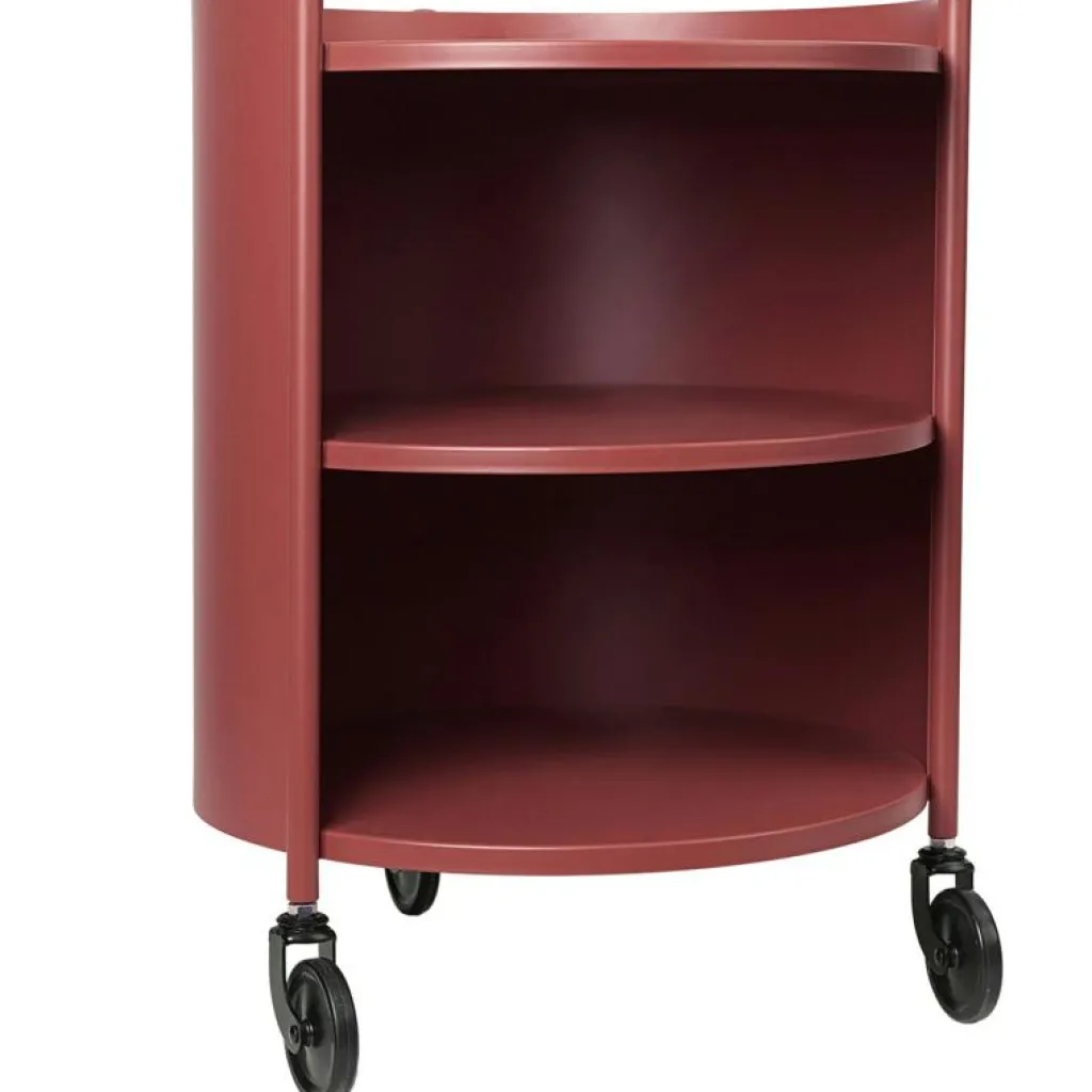 – Det är gjort av pulverlackerat stål i olika färger och har en cylindrisk form med tre hyllplan och hjul.
