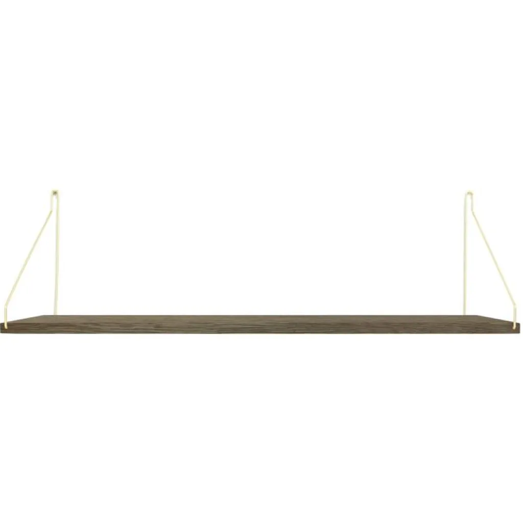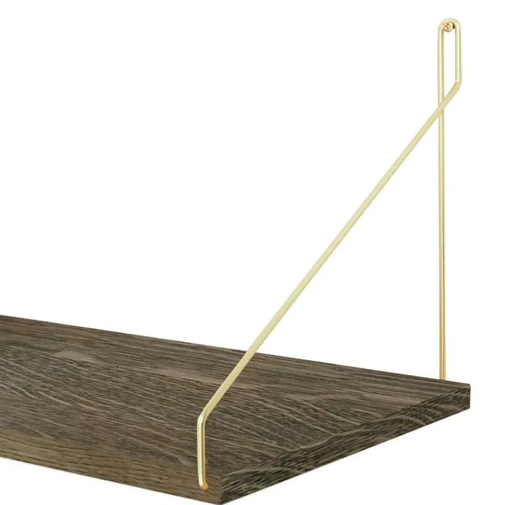 Hyllanplanet är tillverkat i mörkoljad massiv ek och konsolerna finns att få i mässing eller svartlackat stål. Välj mellan olika bredder och djup.