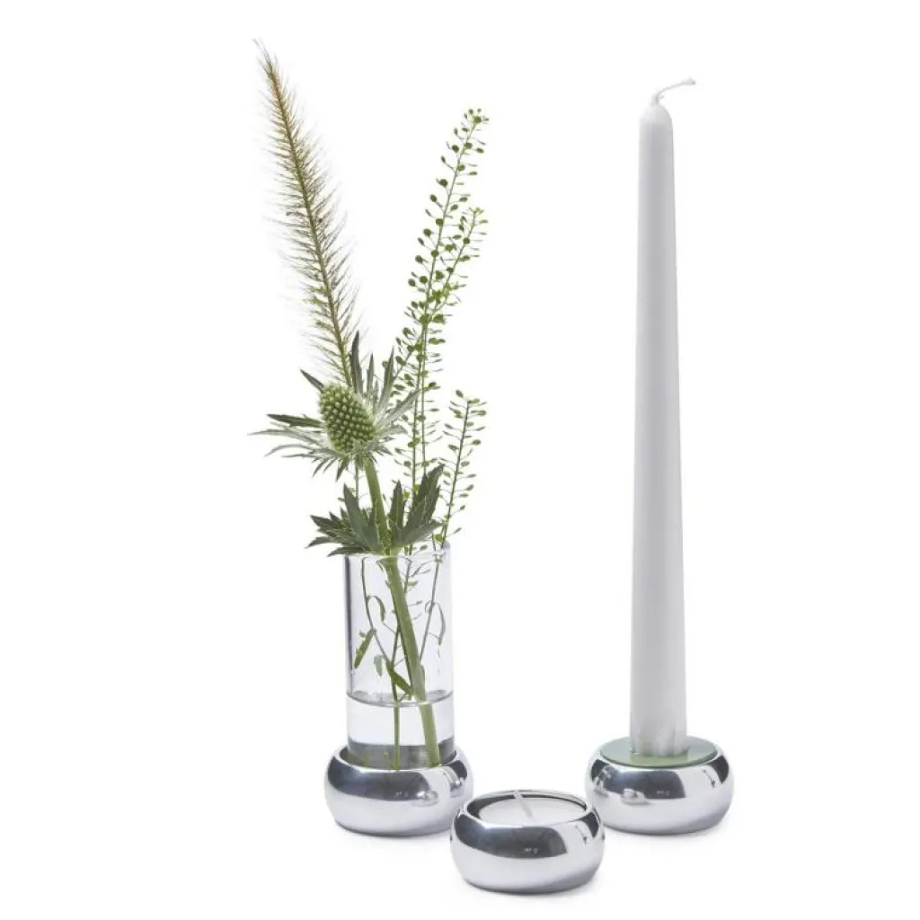 Vackra Constella från Klong som presentförpackning. Denna komposition består av tre enheter, en vas för blommor samt två olika ljushållare, en för höga ljus och en för värmeljus. Mixa och matcha efter humör och inredning. Skillnaden från originalutförandet av Constella är att delarna i denna inte sitter ihop med varandra. Constella presentförpakcning finns precis som stora Constella i mässing och aluminium.