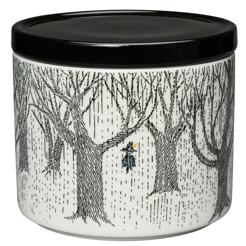 Den här burken från Arabia berättar en historia om hur Muminfamiljen startat ett nytt liv i en fyr i Mumindalen. Porslinsserien ”Trogen sitt ursprung” har sina rötter i två olika historier, ”Pappan och havet” och ”Sent i november”, där man får följa författaren och illustratören Tove Jansson och hennes känslokamp med sorg och längtan efter att hennes mamma gick bort.