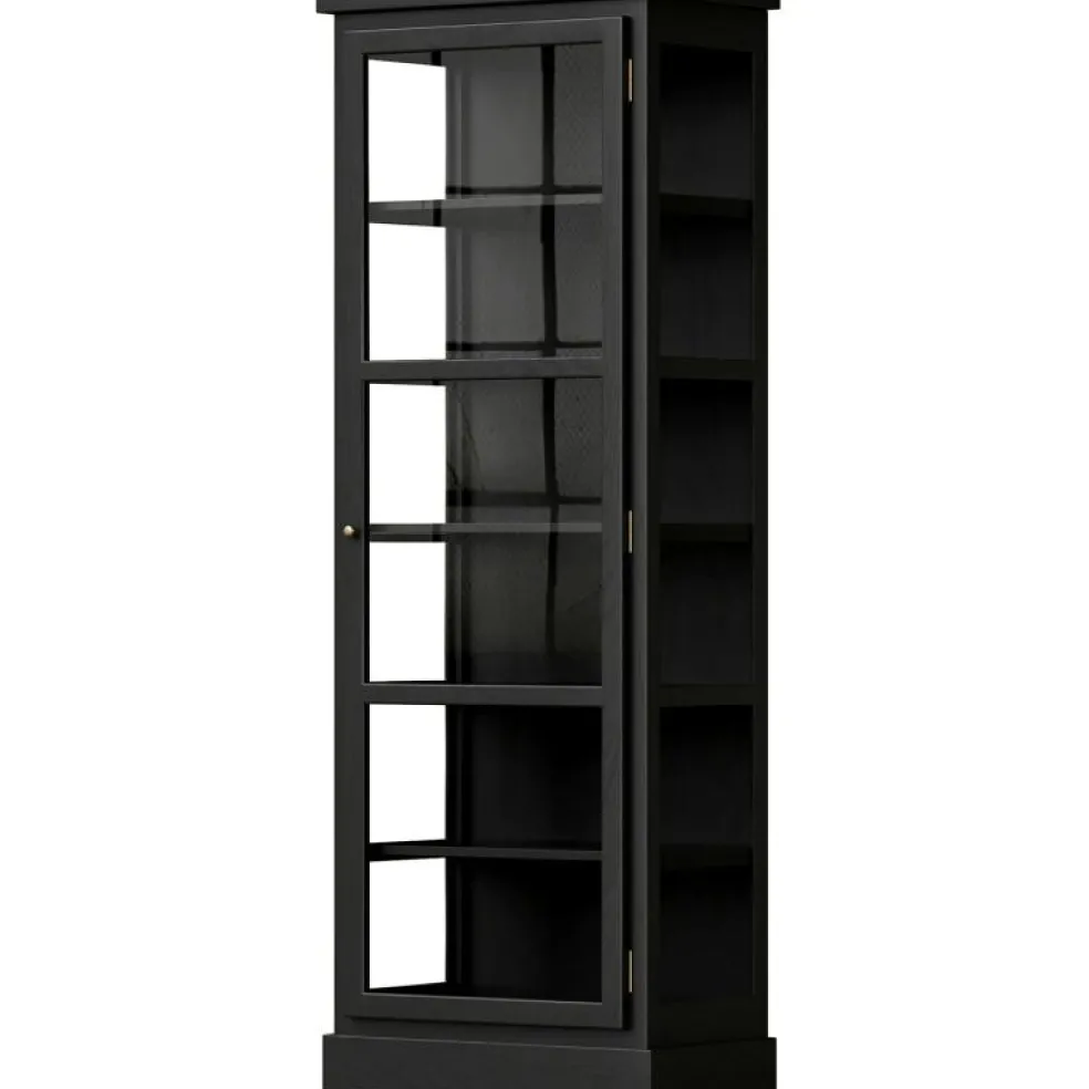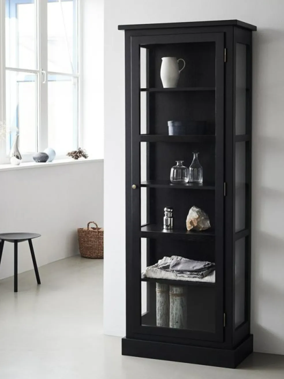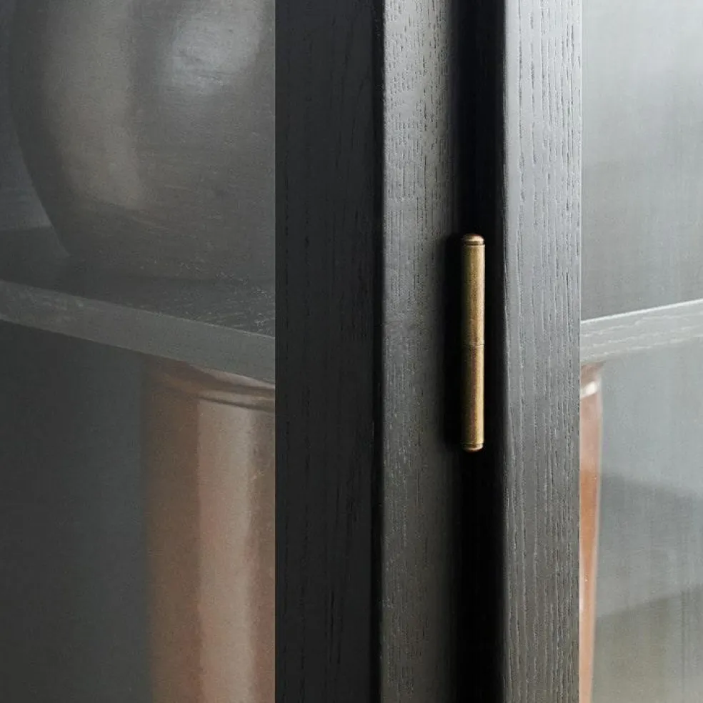 N1 Vitrinskåp från Lindebjerg Design. N-serien omfattar minimalism. De snäva, rena linjerna ger skåpen ett modernt utseende, med färre detaljer än den klassiska V-serien.Skåpet är prytt med en mässingsknopp för att öppna dörren och på insidan ryms fem hyllplan.