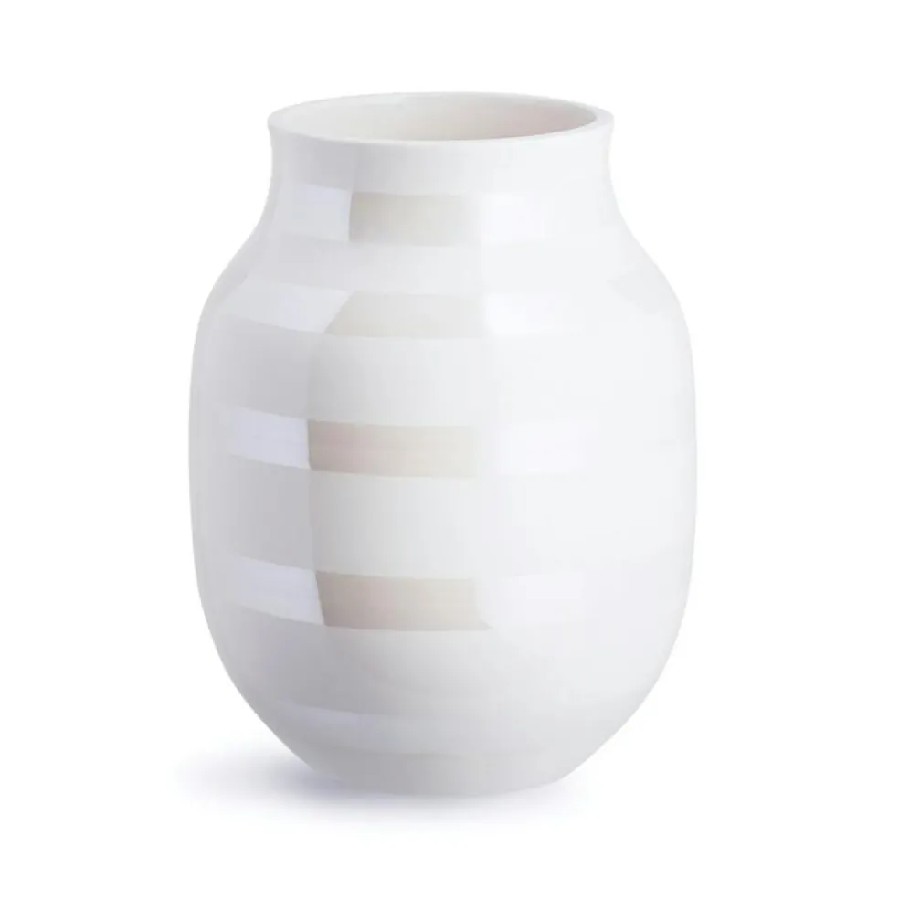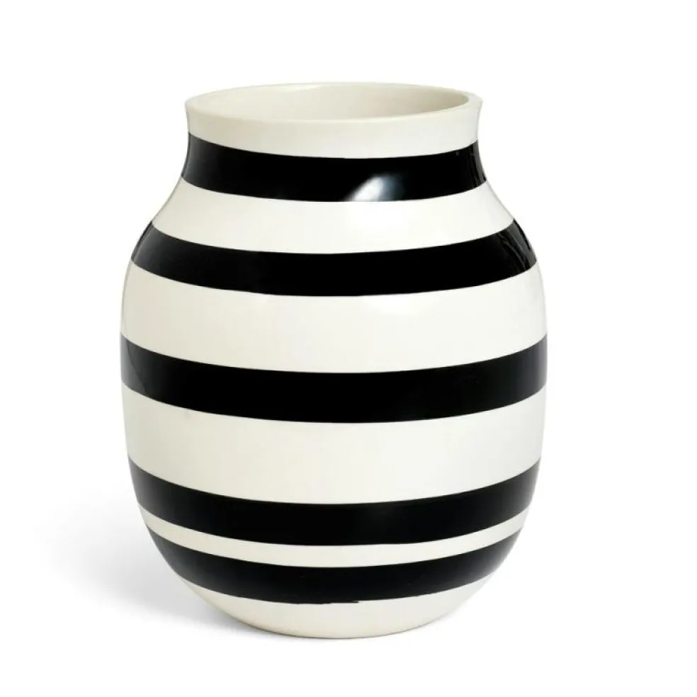 En randig vas med runda mjuka former från varumärket Kähler. Vasens design har ett tidlöst uttryck och kan enkelt kombineras med övriga inredningsdetaljer i hemmet. Denna vas ingår i Omaggio-serien och finns i flera storlekar och färger. Eftersom vasen är handmålad kan det förekomma variation i rändernas bredd och färgmättnad, vilket också gör varje vas unik.