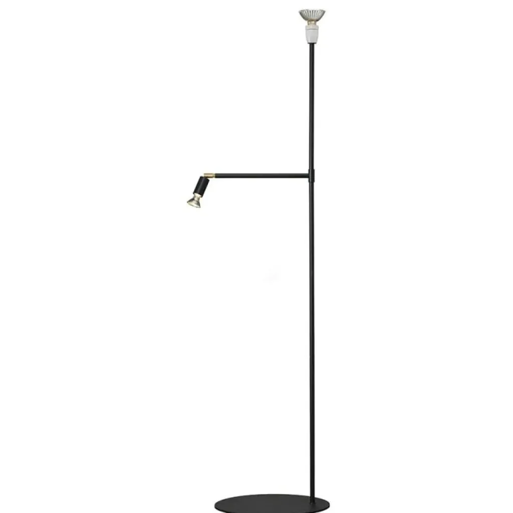 Golvlampa helt i svart struktur (mässing). Anslutning: 2,5 m kabel med dimmer och stickpropp. Ljuskälla: 1x75W halopar 30 E27 och 1x50W Halopar 16 GU10. Fotdiameter: 40 cm.