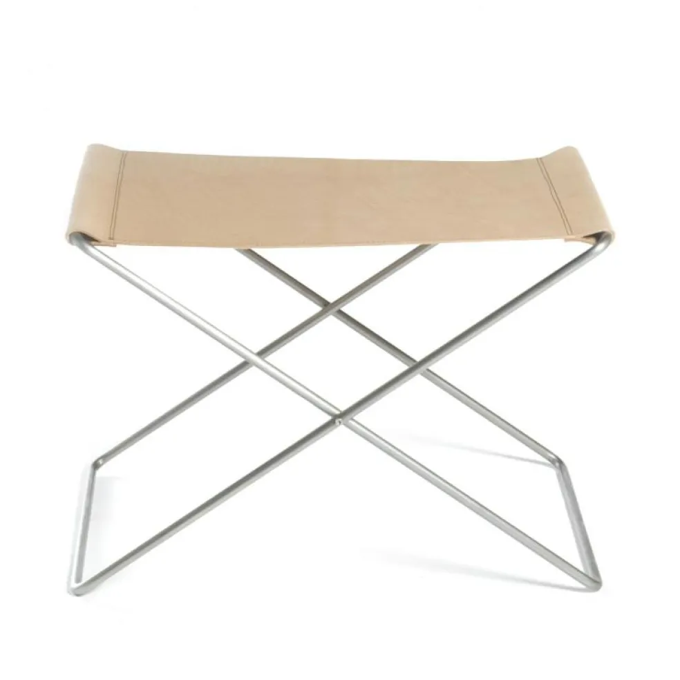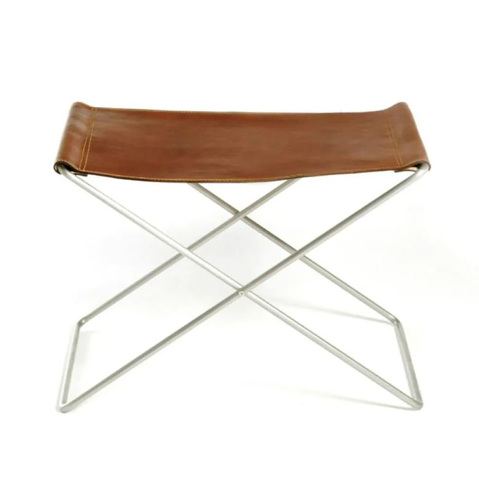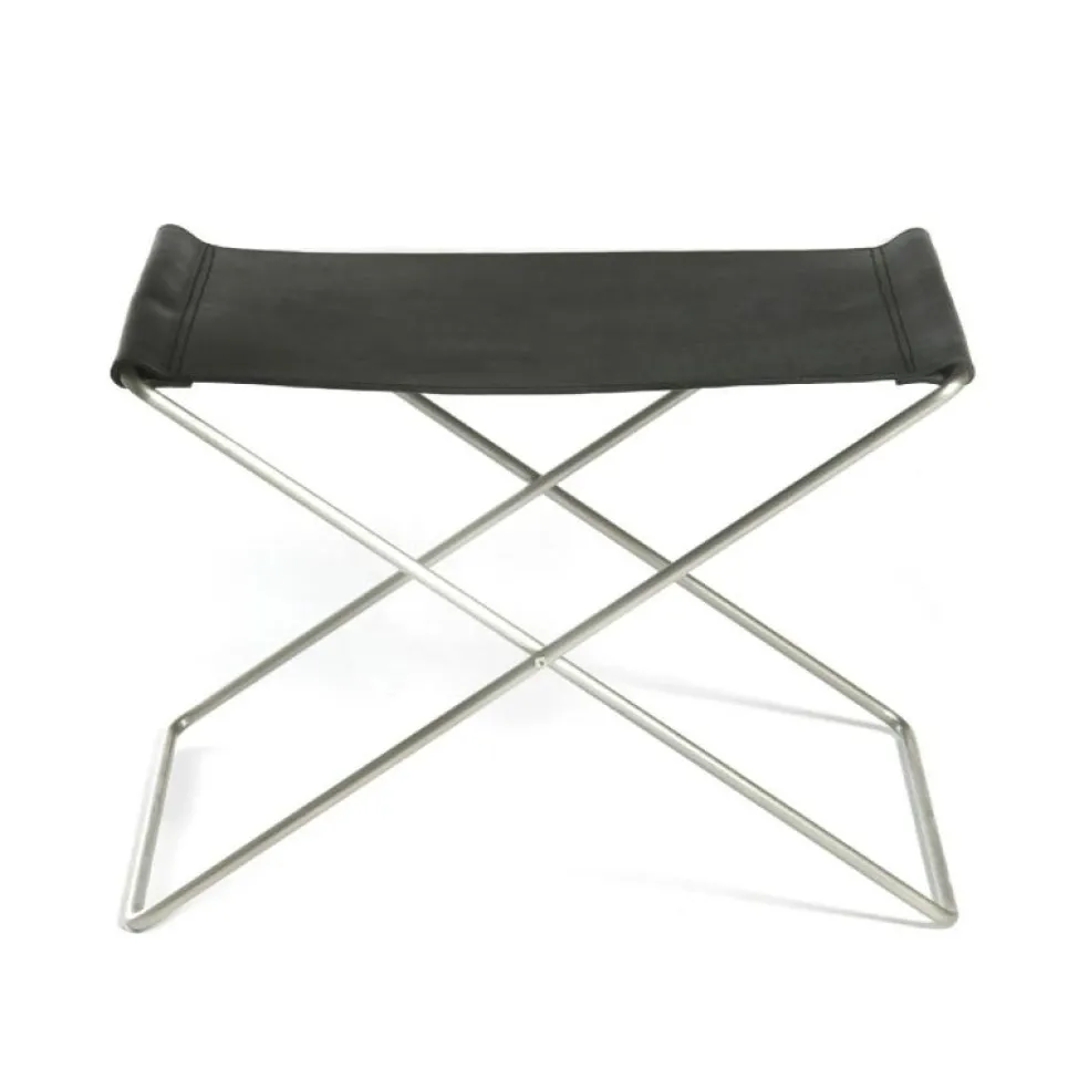 En stilren fotpall med stålstativ och sits av 100% vegetabiliskt garvat läder, med en tjocklek på minst 3 mm. Finns med benställning i pulverlackerat eller rostfritt stål.