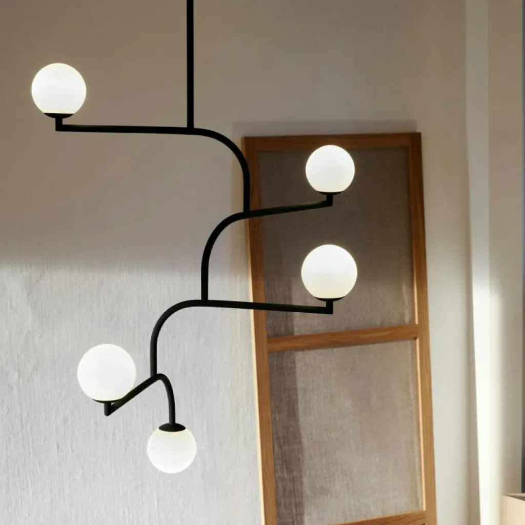Den här unika pendellampan är en del av Mobil-serien som är designad av Monika Mulder för Pholc. Mobil 100 är uppbyggd av fem armaturer som är sammanlänkade med varandra. Monika har tagit inspiration från New York och de svarta balkongerna med räcken av stål samt de runda gatlyktorna, och resultat blev den här taklampan som liknar en mobil. Tack vare dess konstruktion så ser den bra ut från alla vinklar, vilket gör den mångsidig och användbar i alla rum. Finns i tre färger.