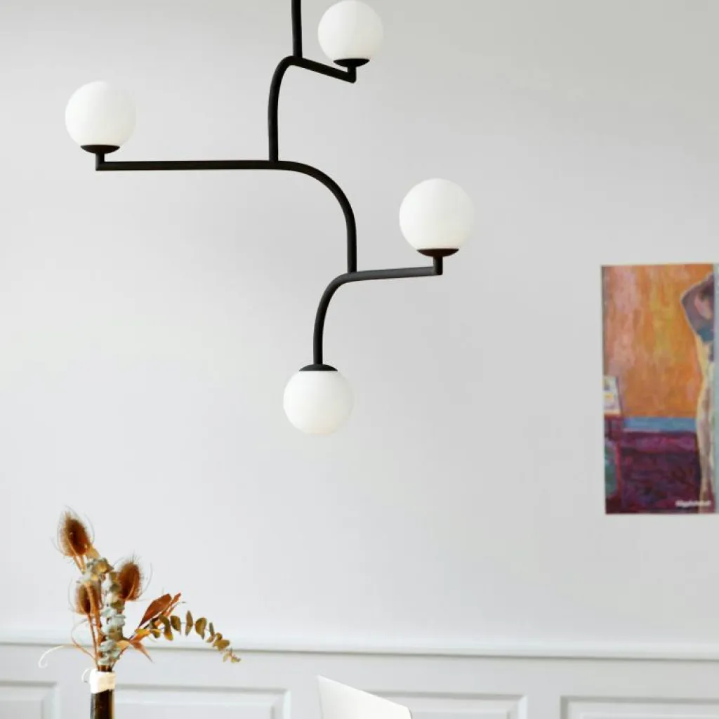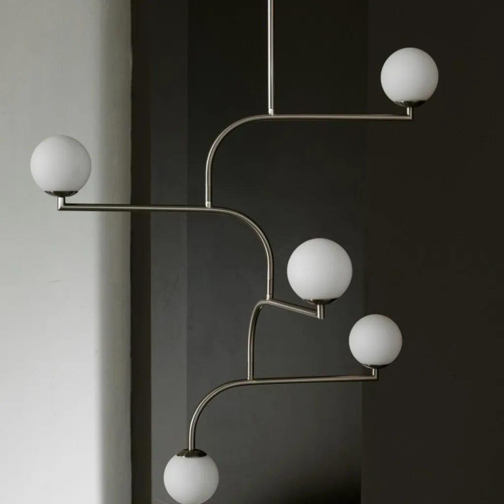 Mobil 100 är en taklampa med en gedigen och innovativ design av Monika Mulder där formen, opalglaset och metallen kompletterar varandra.