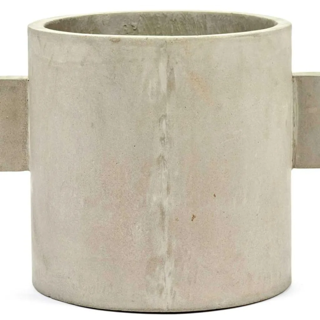Snygg betongkruka i cylinderform, med detaljer i form av raka handtag på sidorna.