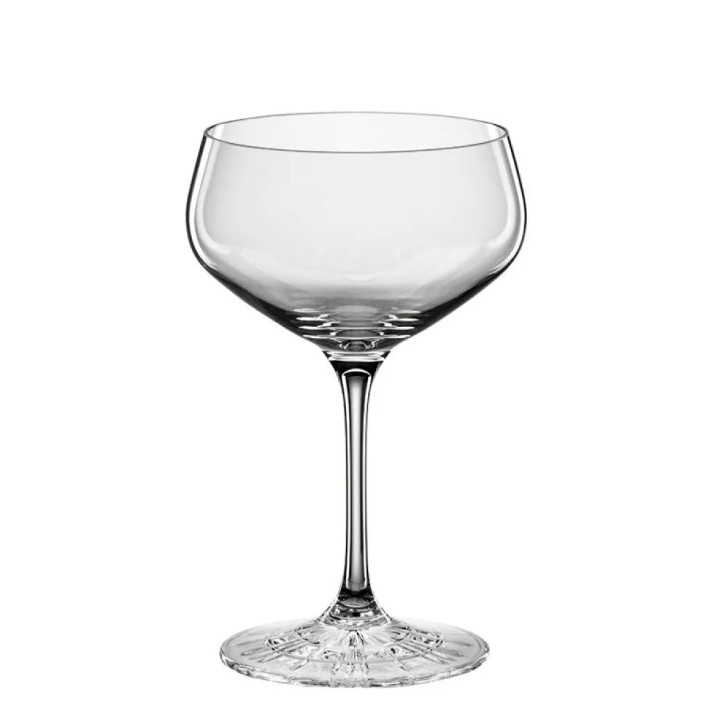 4-pack med Perfect Serve Coupette Glas från Spiegelau. Dessa glas tillhör serien Perfect Serve som har tagits fram tillsammans med den internationellt prisade barexperten Stephan Hinz. Resultatet blev glas med vackra slipade detaljer, tillverkade i slitstarkt glas. Det här glaset passar perfekt för drinkar, men går även att använda som champagneglas.