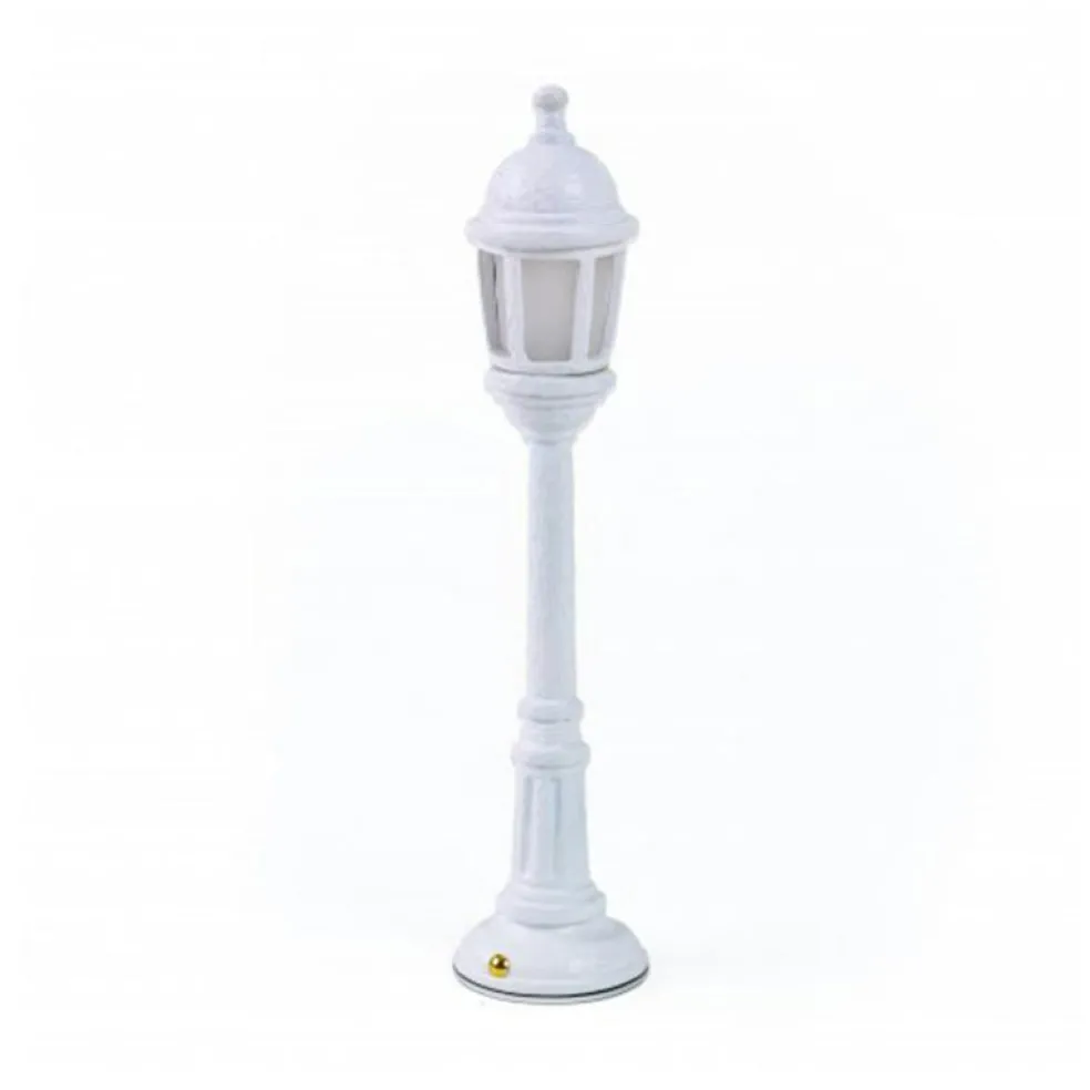 En portabel gatlykta i miniatyr skapad i resin, ett material som påminner om porslin. Street Lamp Dining Bordslampa ärlätt att ta med sig på picknicken, dekorera middagsbordet med eller lysa upp bokhyllan hemma. Lampan är sladdlös och laddas enkelt via en USB-port.