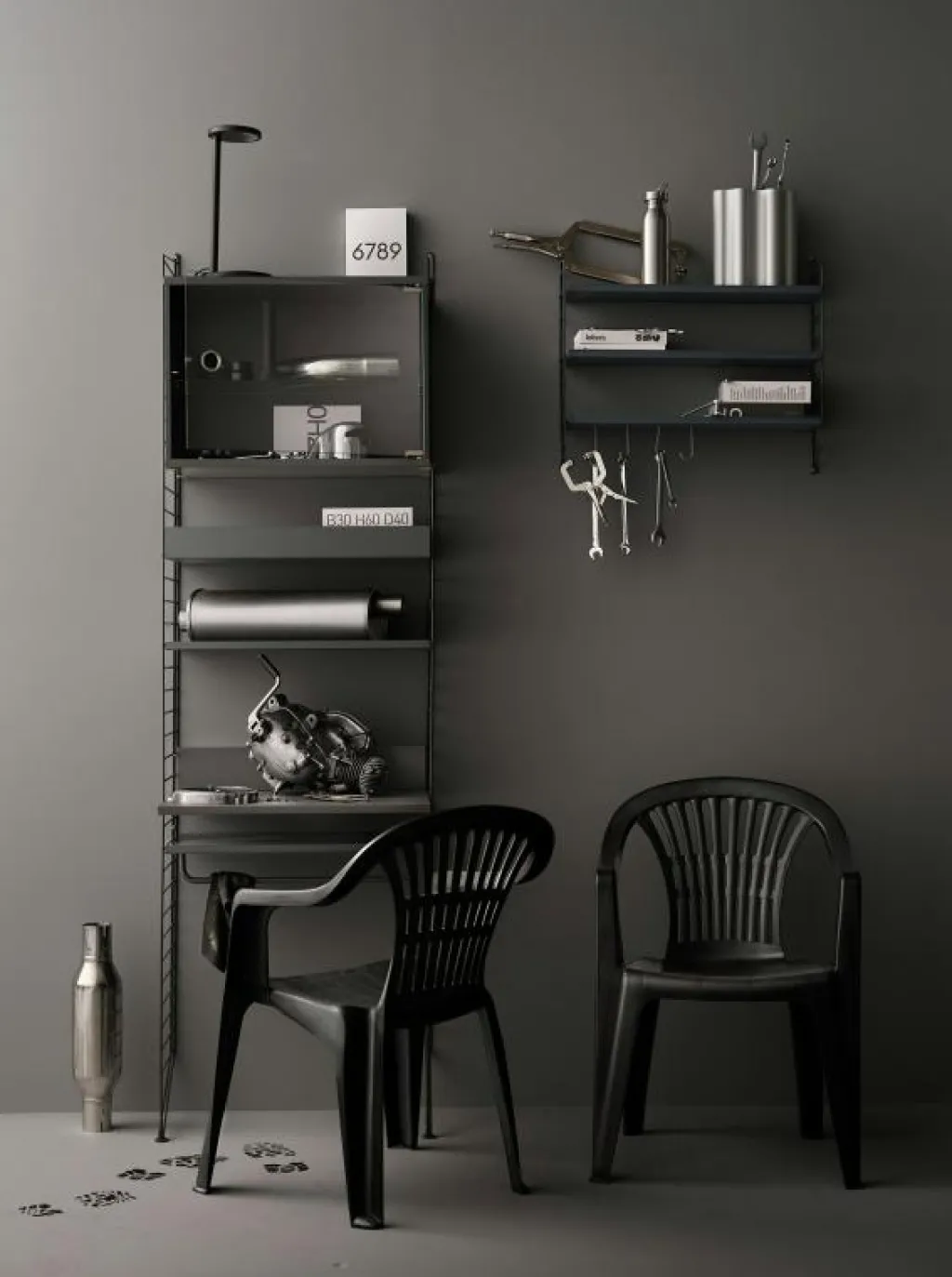 – Kombinera stången med metallhyllplan från String.