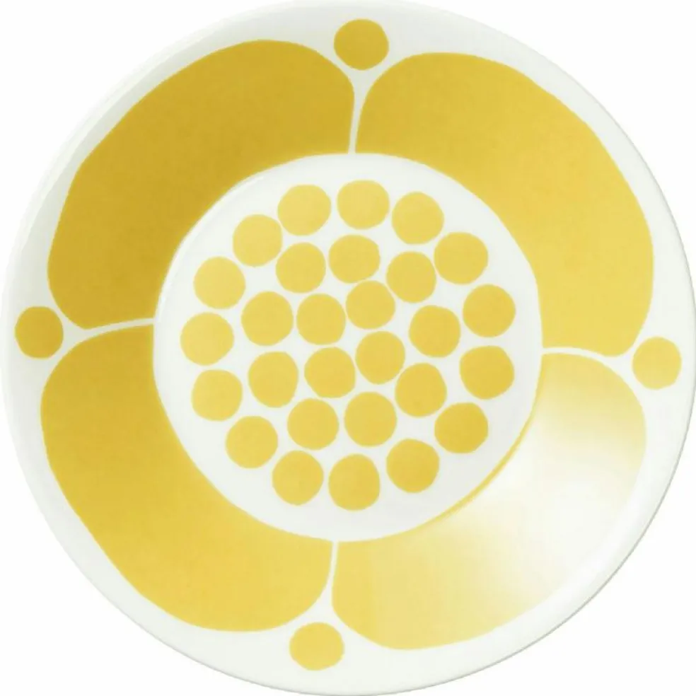 Lekfullt fat i vitroporslin från Arabia med ett gult mönster som utstrålar positivitet.