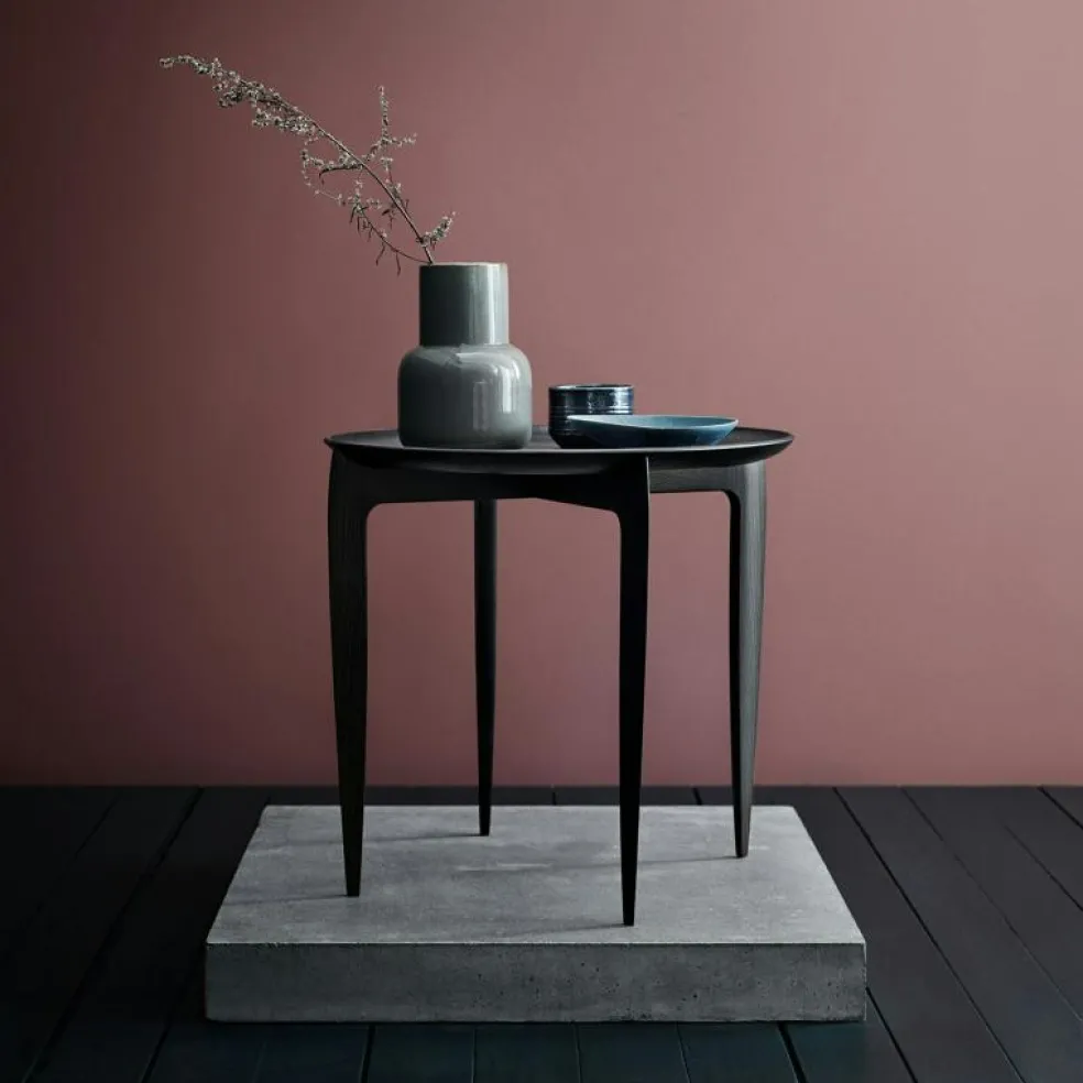 Tray Table Sidbord från Fritz Hansen. Bordet formgavs redan 1958 av Willumsen & Engholm. Den eleganta basen är hopfällbar och brickan är tillverkad av gjuten fanér – samma material som används vid tillverkning av den klassiska stolen Sjuan. Välj mellan ek eller svartlackerad ek.