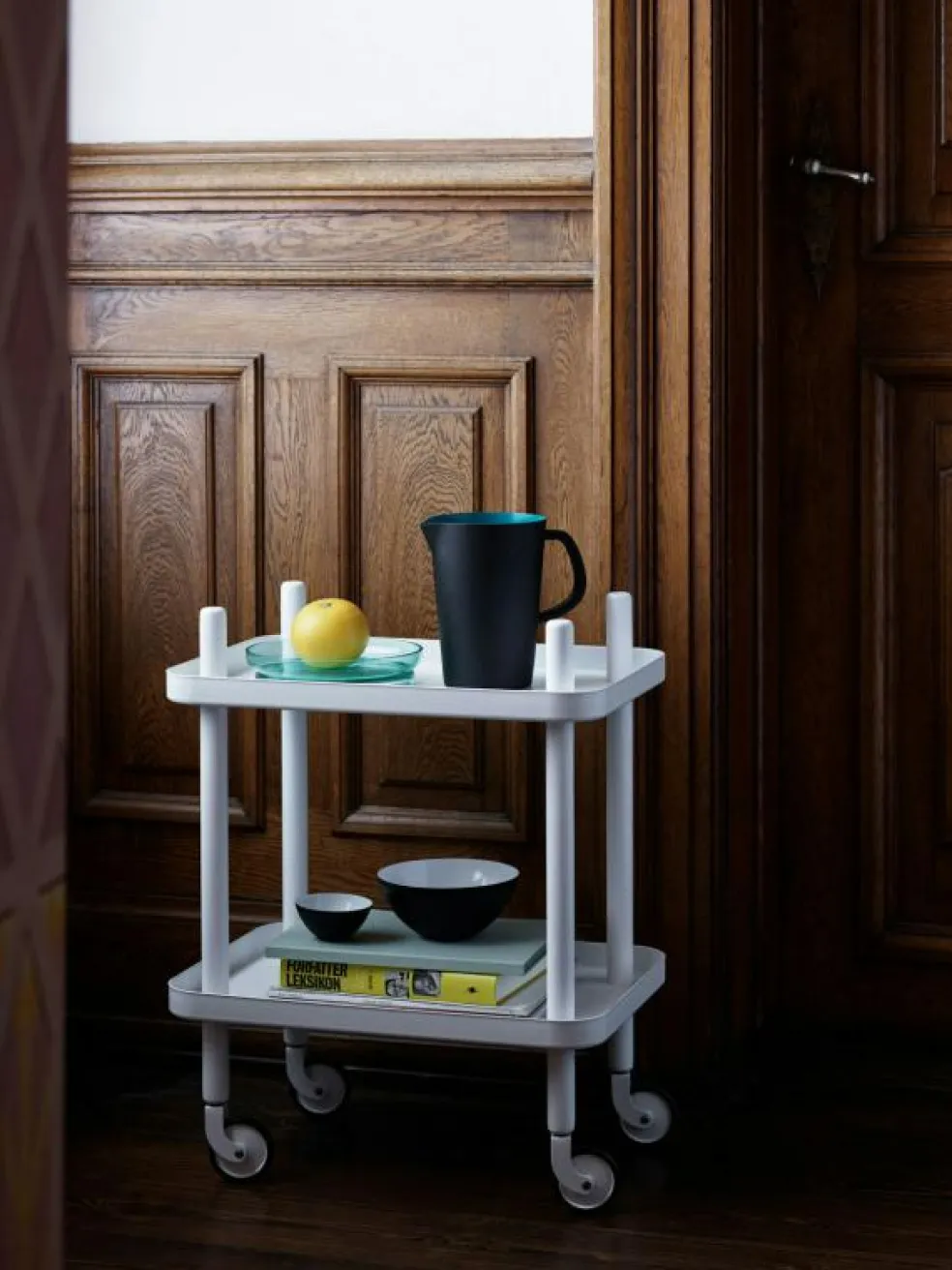 Block Table från danska Normann Copenhagen är ett praktiskt rektangulärt bord med hjul som även kan användas som serveringsvagn. Bordet är tillverkat av målad ask och pulverlackad stål. De fyra hjulen på vagnen är utrustade med en svart nylonring som gör bordet stabilt och ger ett bra grepp. Hjulen är färgade i samma nyans som brickorna för att skapa ett snyggt och enhetligt intryck. Handtagen på vagnen gör den lätt att flytta runt på och gör även att bordet kan användas för olika ändamål beroende på hur behoven skiftar med åren. Välj mellan färgerna svart och vit.