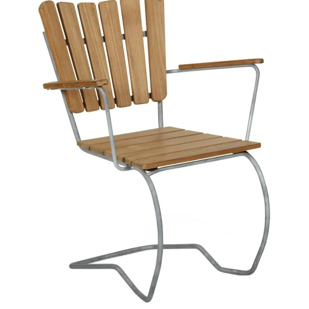 Den har tidstypiska träribbor i teak och ett snyggt, enkelt underrede i varmgalvaniserat stål.
