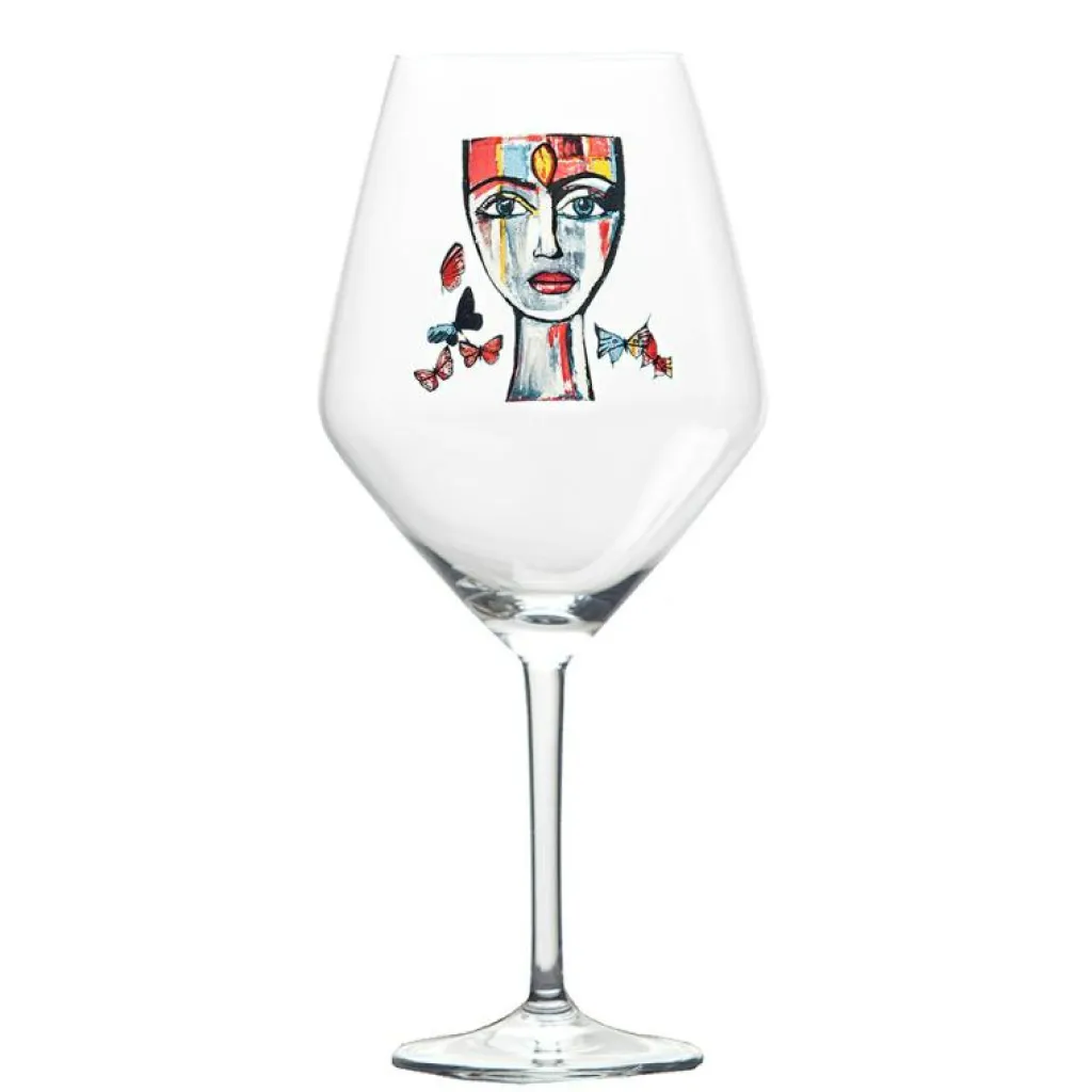 Vinglas från Carolina Gynning. Det här vinglaset har en hög fot och avsmalnande form, i fokus är porträttet av en stark kvinna. Det är formgivaren Carolina Gynning som med stor passion och kärlek tagit fram detta färgglada motiv, som återspeglar hennes bubblande och utåtriktade personlighet. Vi rekommenderar att glaset diskas för hand.