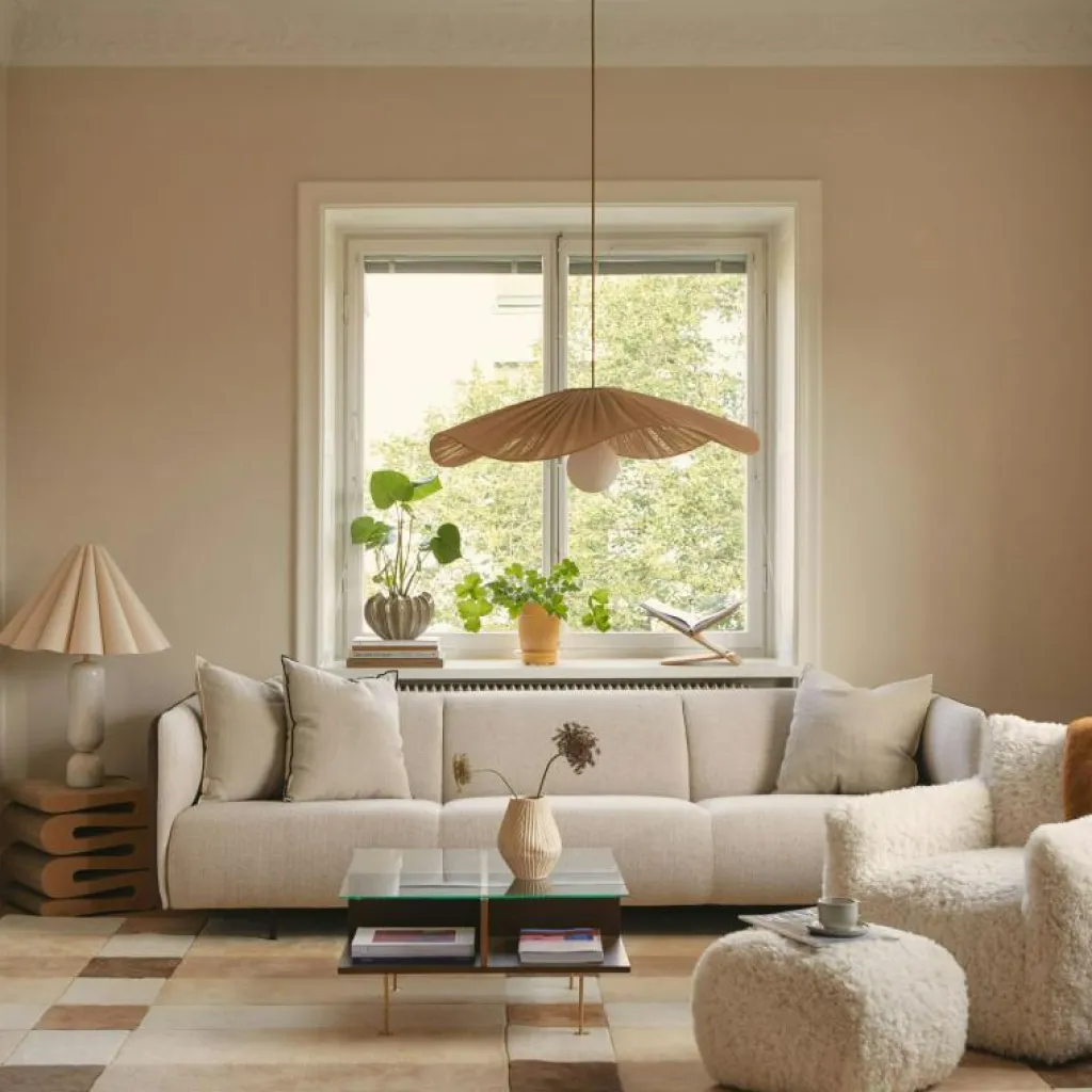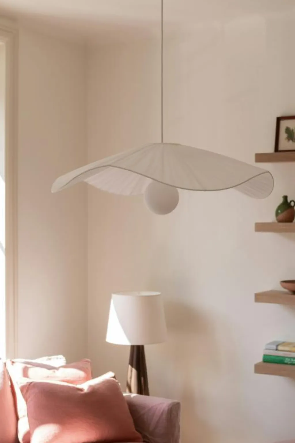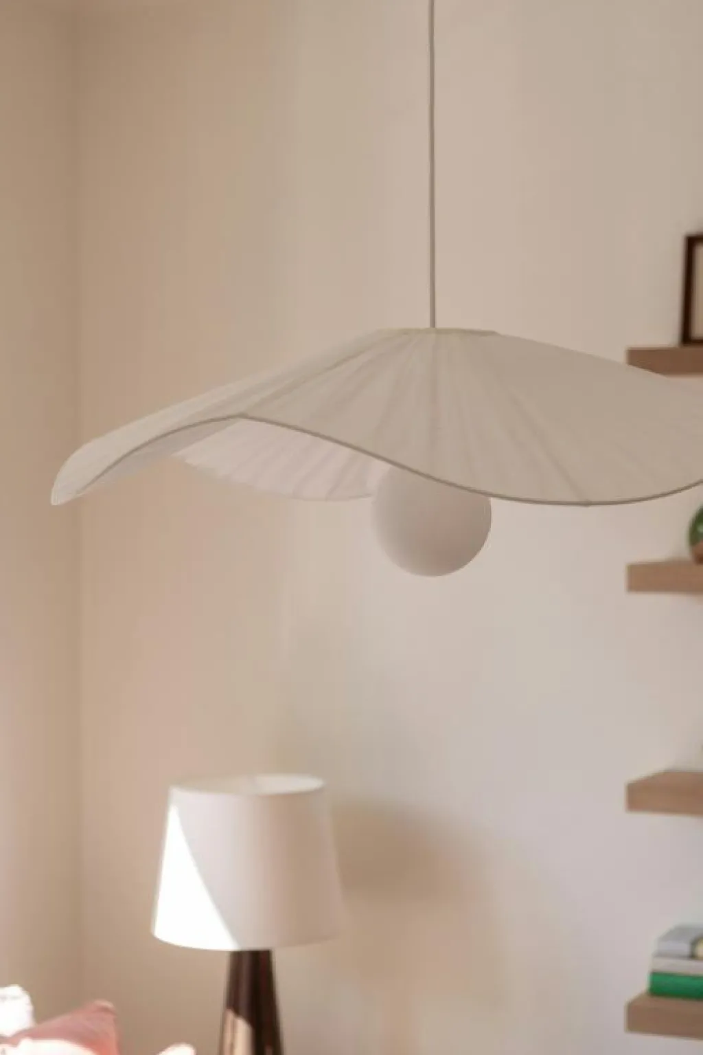 – Den unika, vågformade lampskärmen ger ett mjukt och stilrent intryck som förhöjer rummets atmosfär.
