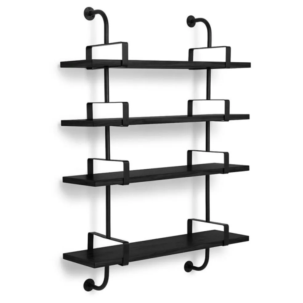 Ett hyllsystemsom äranpassningsbartefter tycke och yta. Svartlackerade gavlar och hyllplan av trä som adderar en ny nivå av estetik till ditt hem.