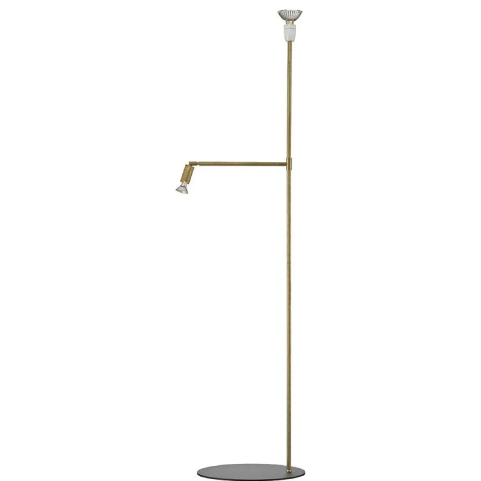 Golvlampa i rå mässing med svart fot. Anslutning: 2,5 m kabel med dimmer och stickpropp. Ljuskälla: 1x75W halopar 30 E27 och 1x50W Halopar 16 GU10. Fotdiameter: 40 cm.