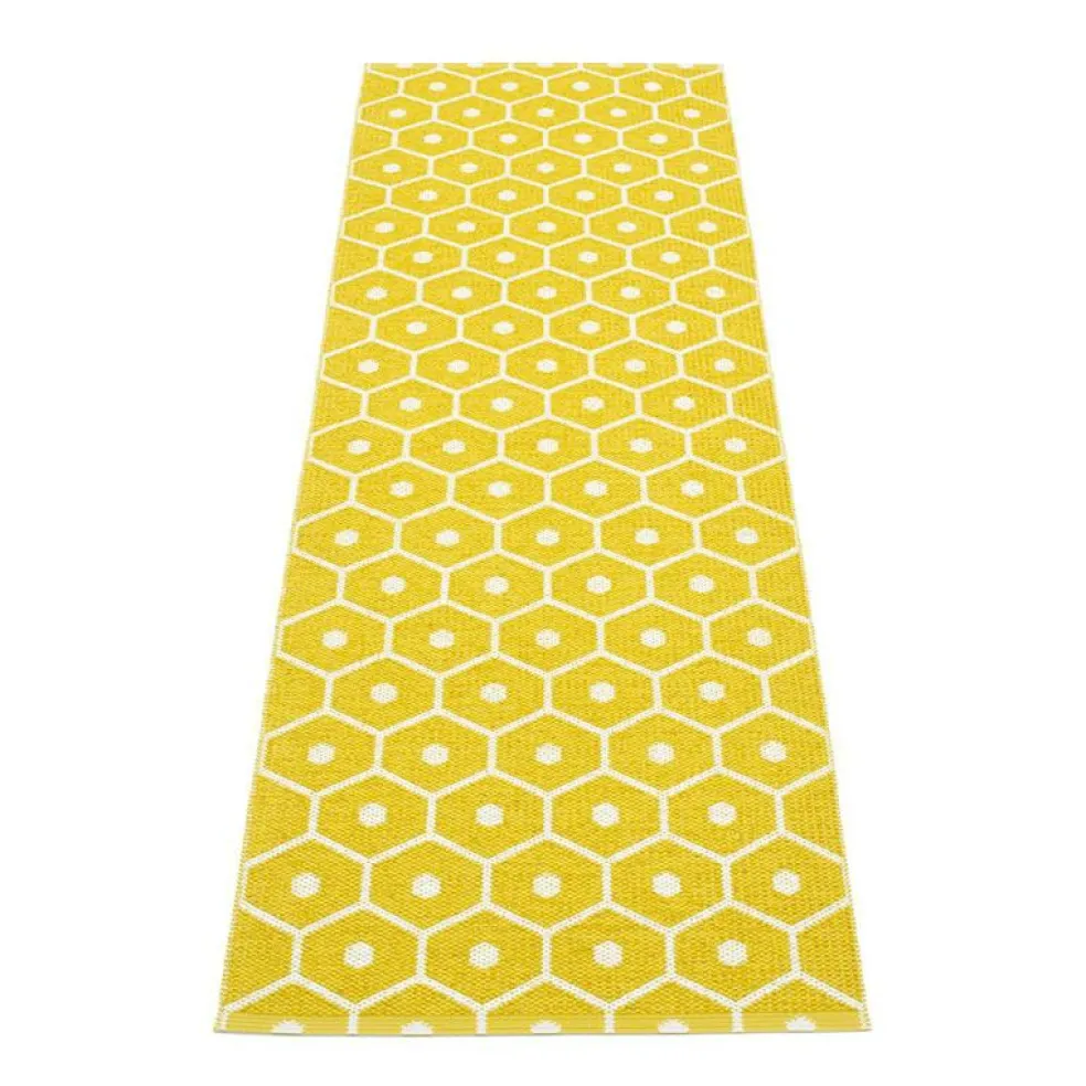 Honey är en plastmatta från Pappelina med honungskakemönster som finns i flera olika kulörer. Mattan Honey är vändbar och färgerna är omvända på baksidan. Tacka vare det fantastiska materialet fungerar Honey lika bra inne som ute och är enkel att rengöra. Se skötselråd för hur du underhåller din matta på bästa vis.