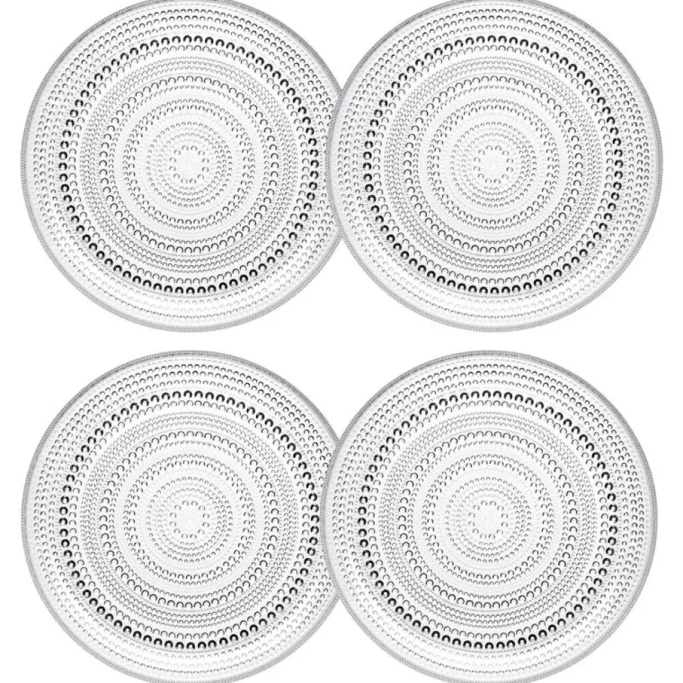 Fyra glastallrikar som tillhör den populära serien Kastehelmi från Iittala, och påminner om dagg som glittrar i gräset på morgonen. Perfekt att servera favoritfikan på, eller som en inredningsdetalj med ett ljus på. Formgiven av Oiva Toikka år 1964.