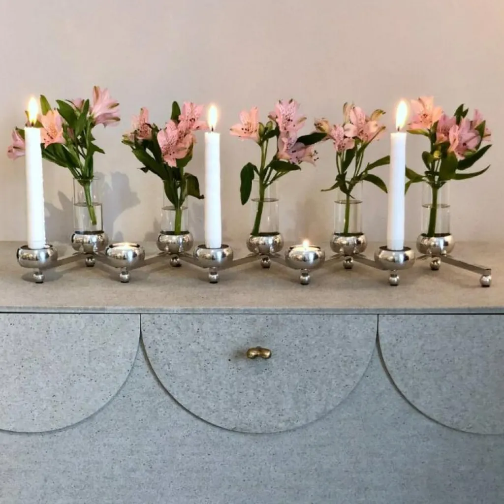 Constella går att förvandla till en ljusstake för höga ljus genom att köpa till aluminiuminsatserna, paketet innehåller fem insatser så för denna stora Constella krävs två paket med ljusinsatser. Det går även att göra Constella till en vas, eller tio små vaser, med hjälp av glasinsatser. Även det paketet innehåller fem insatser och det krävs två paket för att fylla hela Constella Stor.