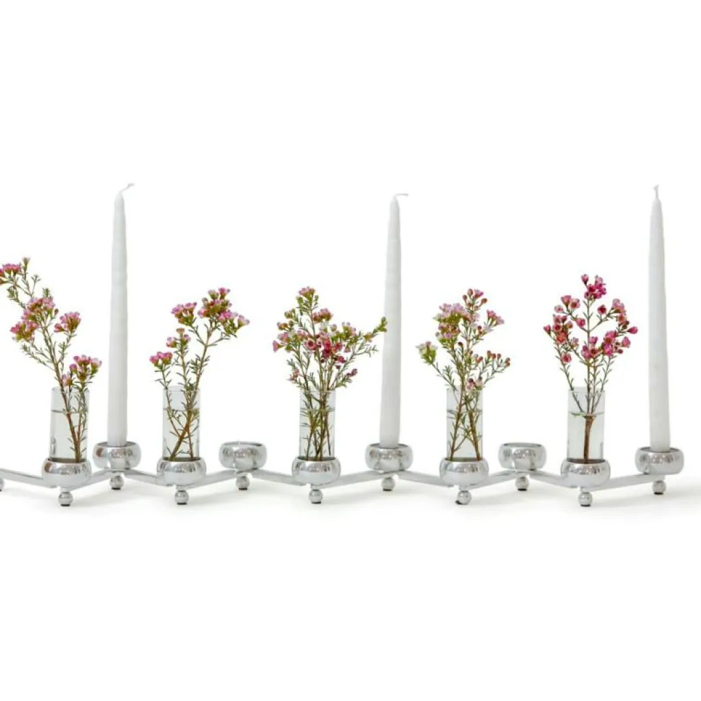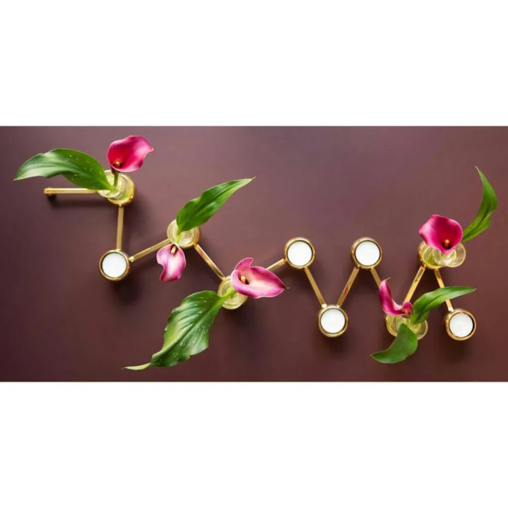 Constella, ljusstake formgiven av Eva Schildt för Klong. Den vackra ljusstaken Constella finns i mässing och aluminium och för fem eller tio ljus. Constellas armar är vridbara och ljusstakens form kan ändras efter tycke och smak. En elegant stilren inredningsdetalj vars utseende enkelt kan förnyas genom att byta form. Constella går att forma på flera olika vis, exempelvis som ett zickzackmönster eller som en cirkel.