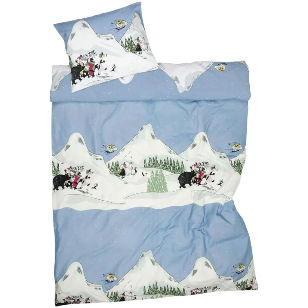 Arabias nya vinterkollektion 2024 fortsätter med ett vintersportäventyr – backhoppning. Illustrationen fångar Mumintrollet i full fart nedför backen, flygande som en vante i luften för att landa obekvämt i träden.