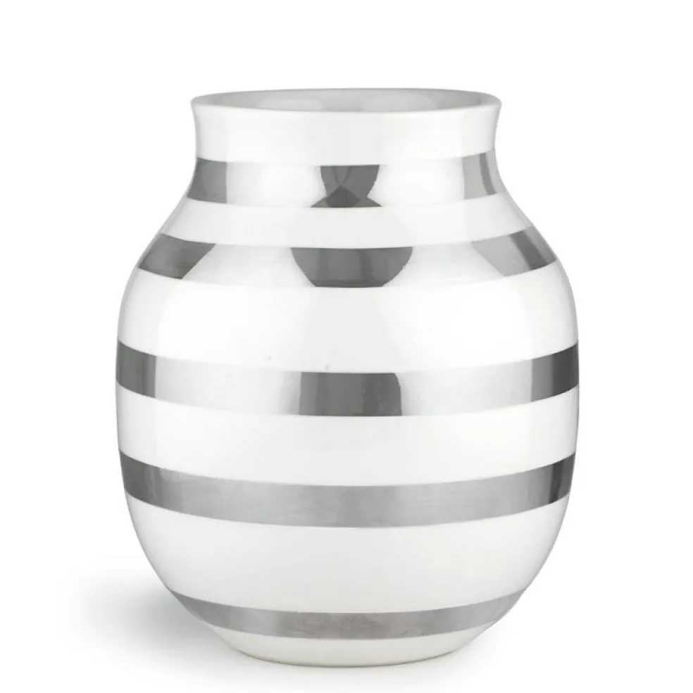 En randig vas med runda mjuka former från varumärket Kähler. Vasens design har ett tidlöst uttryck och kan enkelt kombineras med övriga inredningsdetaljer i hemmet. Denna vas ingår i Omaggio-serien och finns i flera storlekar och färger. Eftersom vasen är handmålad kan det förekomma variation i rändernas bredd och färgmättnad, vilket också gör varje vas unik.