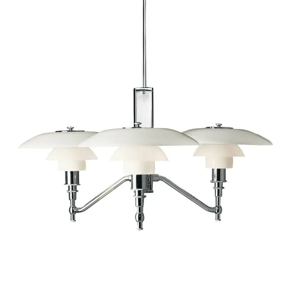 PH 3/2 Akademi pendel från Louis Poulsen är designad av Poul Henningsen och den tillhör den populära treskärmsfamiljen som reflekterar merparten av ljuset nedåt. Armaturen består av en stomme av högglansförkromad mässing samt tre skärmar av munblåst vitt opalglas, vilket ger ett mjukt och diffust ljus. PH-lampornas nummer refererar till skärmstorleken. Ljuskällor ingår ej.