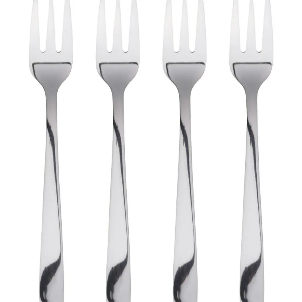 Fyra tårtgafflar i rostfritt stål som tillhör den populära serien Raw från Aida.