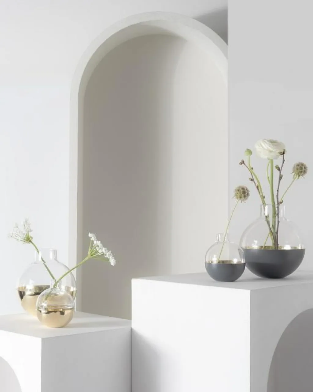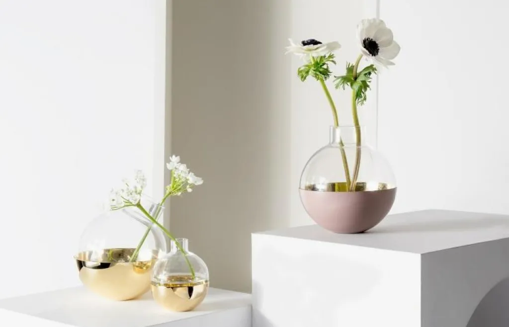 Välj mellan fyra färger på basen – mässing, vit, mörkgrå eller rosa. Kombinera gärna flera färger och storlekar och skapa en unik mix av vackra snittblommor och tända ljus på bordet.