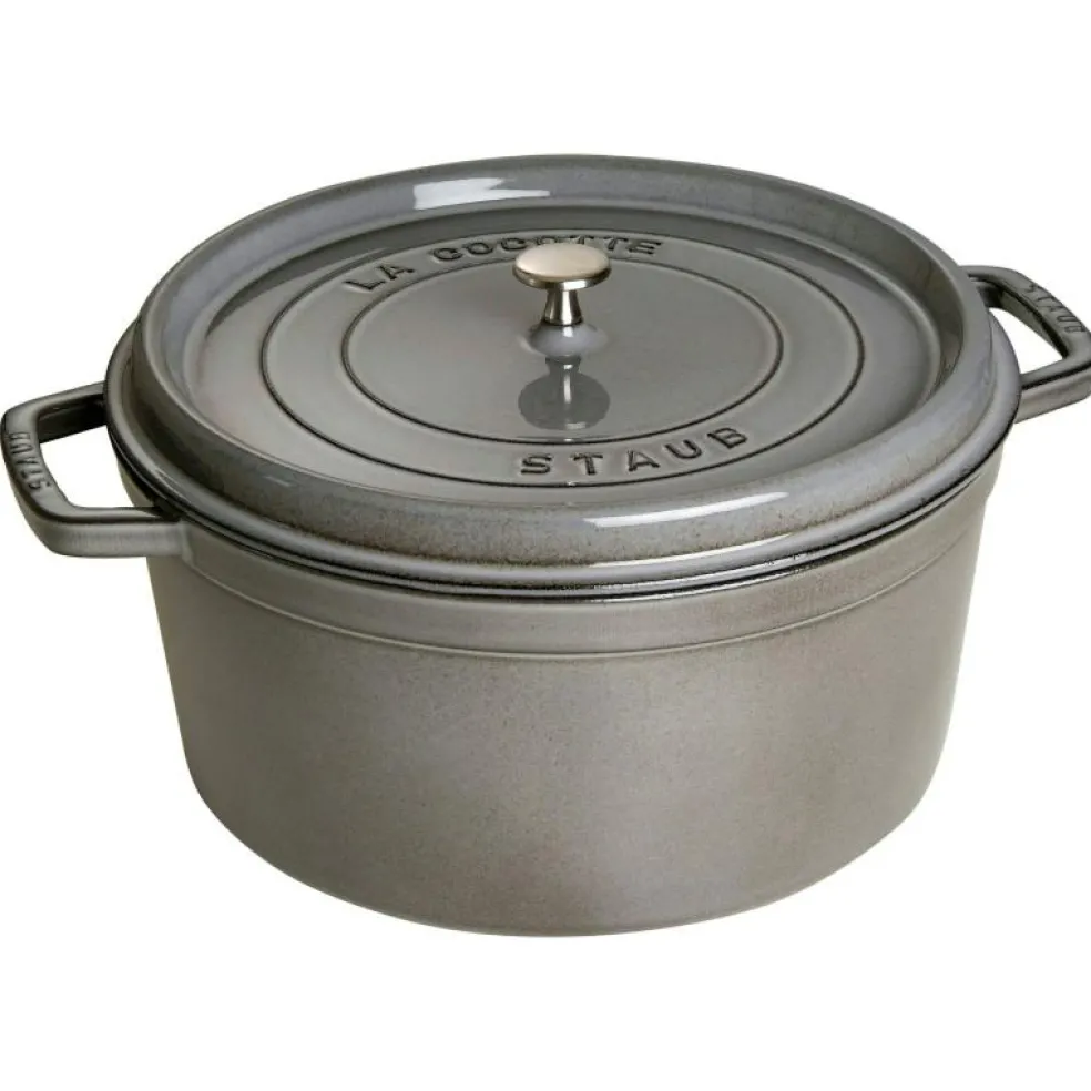 Rund gryta i grått från Staub av emaljerat gjutjärn som tillverkats i Frankrike, ett riktig hantverk. Emaljen är mycket tålig och motståndskraftig mot repor. Grytorna har två lager kvalitativ blank emalj på utsidan och matt svart emaljering på insidan. Grytan har även ett praktiskt självösande lock med piggar på undersidan som gör att den kondenserade ångan dropparna jämnt fördelat över maten istället för att rinna ut med sidan av grytan. Det platta lockets form och vikt sluter in ångan perfekt och bevarar matens smaker och vitaminer. Grytan rostar inte, tar inte smak av olika råvaror och är mycket lättskött. Kan användas på alla värmekällor. Den emaljerade undersidan skyddar hällen från repor. Handdisk rekommenderas för längre livslängd på produkten.