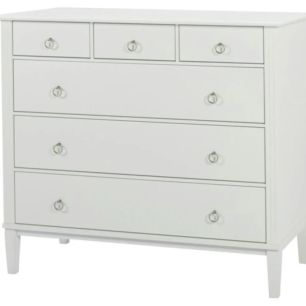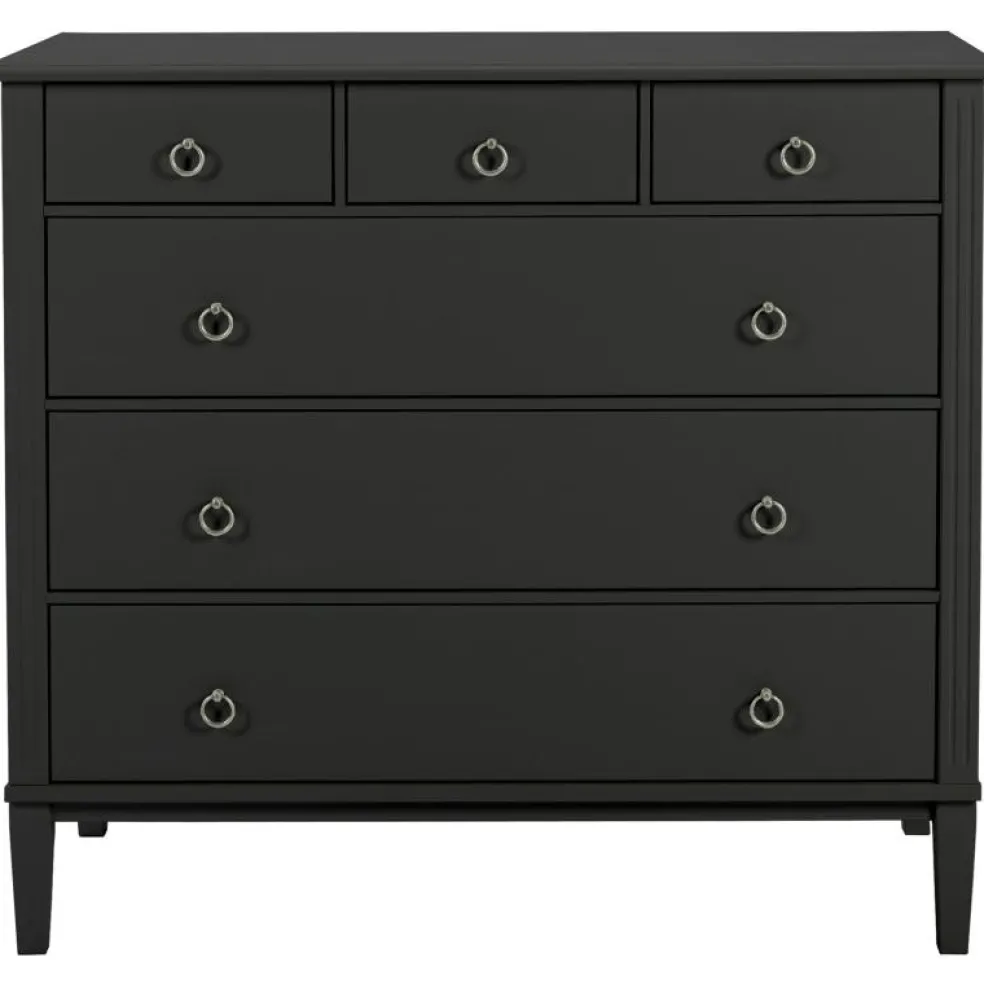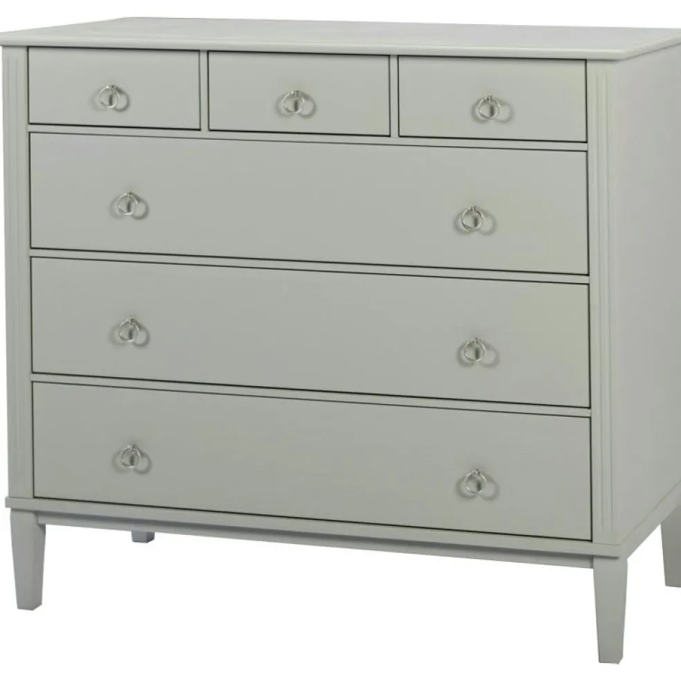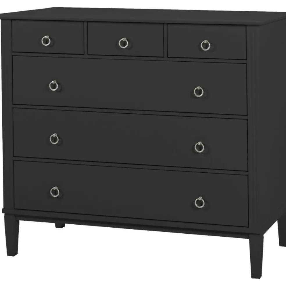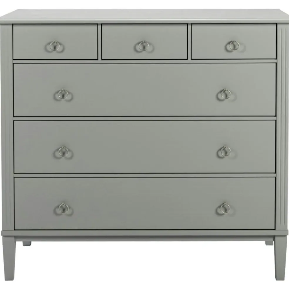 Det är tillverkat i massiv furu, MDF och sedan handmålat. Byrån har 6 lådor med ringhandtag i mattkrom.