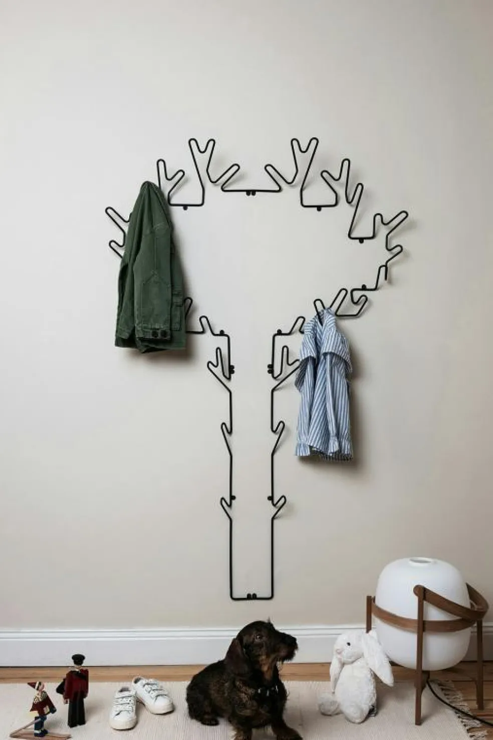 En ypperlig klädhängare för större familjer med formen av en trädsiluett vars grenar fungerar som krokar.