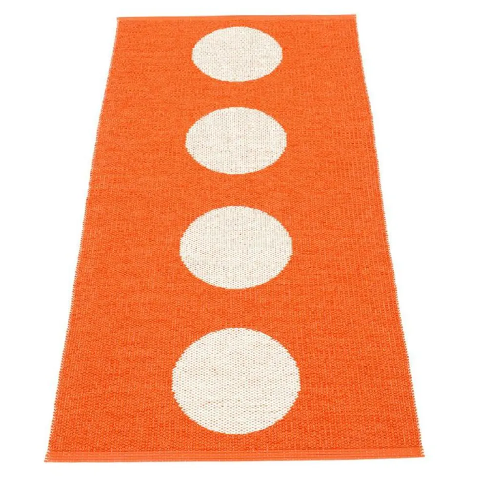 Vera är en plastmatta från Pappelina som med sina prickar lyser upp miljön den placeras i. Vera tål att ligga både ute och inne, passar perfekt i köket eller på balkongen då den är enkel att underhålla och rengöra. Mattan är vändbar och baksidan har omvänd färgställning.