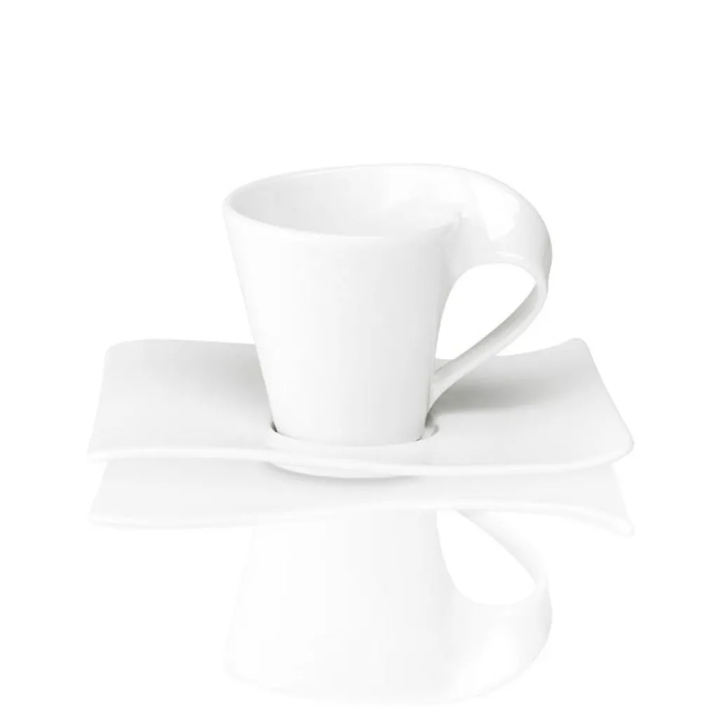 New Wave Caffè Espressokopp och fat från Villeroy & Boch. Den här espressokoppen med tillhörande fat är en del av serien New Wave som kännetecknas av sin innovativa form. Det svepande formen på handtaget är både elegant och ergonomisk. Är tillverkad i premiumporslin och tål både diskmaskin och mikrovågsugn.